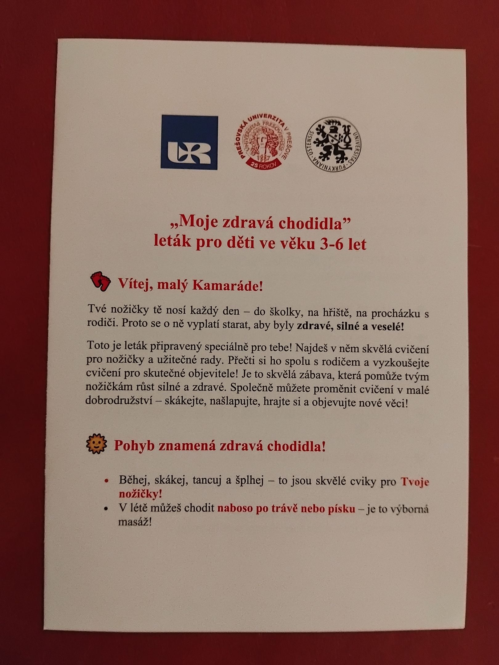 After the educational activities, each child received a leaflet entitled “My Healthy Little Feet,” designed to be accessible and engaging for young children. The material aimed to reinforce the knowledge gained during the sessions, remind children of the principles of proper foot exercises, and encourage them to perform the exercises regularly in their daily life. The leaflet contained simple instructions, allowing children to easily repeat the exercises both at home and at kindergarten, supporting the development of their feet and the care of their arches.