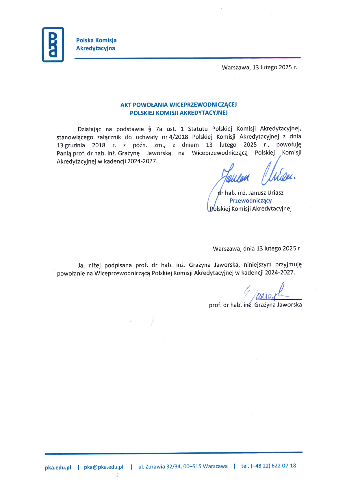 We are honored to announce that as of February 13th of this year, dr hab. inż. Janusz Uriasz, Chairman of the Polish Accreditation Committee, has appointed prof. dr hab. inż. Grażyna Jaworska as Vice-Chairman of the Polish Accreditation Committee for the term 2024-2027.