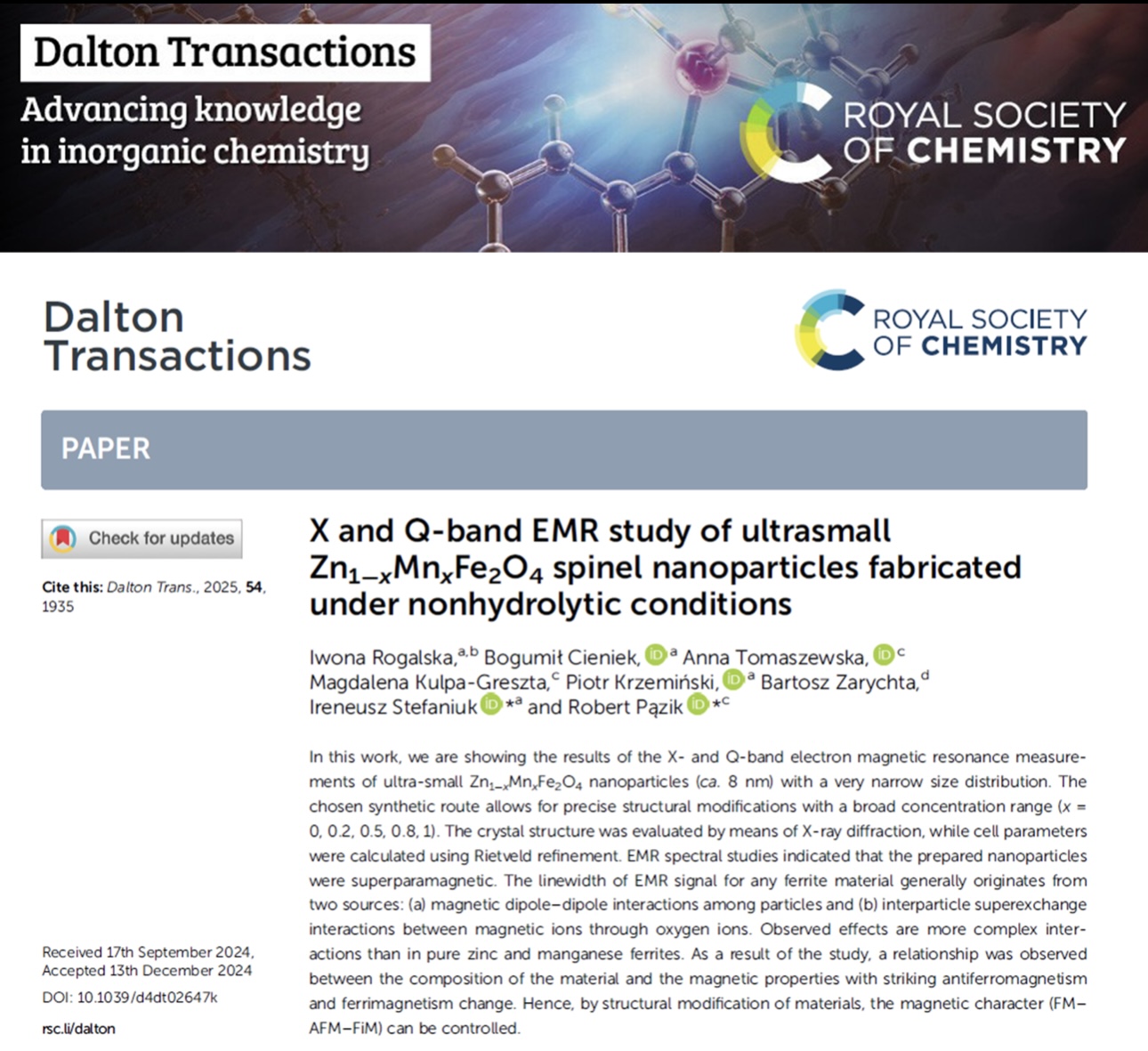 We are delighted to announce that the research article authored by the team of Professor Robert Pązik has been recognized as a HOT Article in the prestigious journal Dalton Transactions (Royal Society of Chemistry), which focuses on the field of inorganic chemistry.