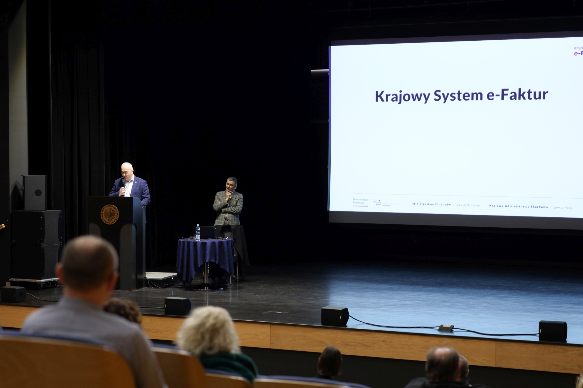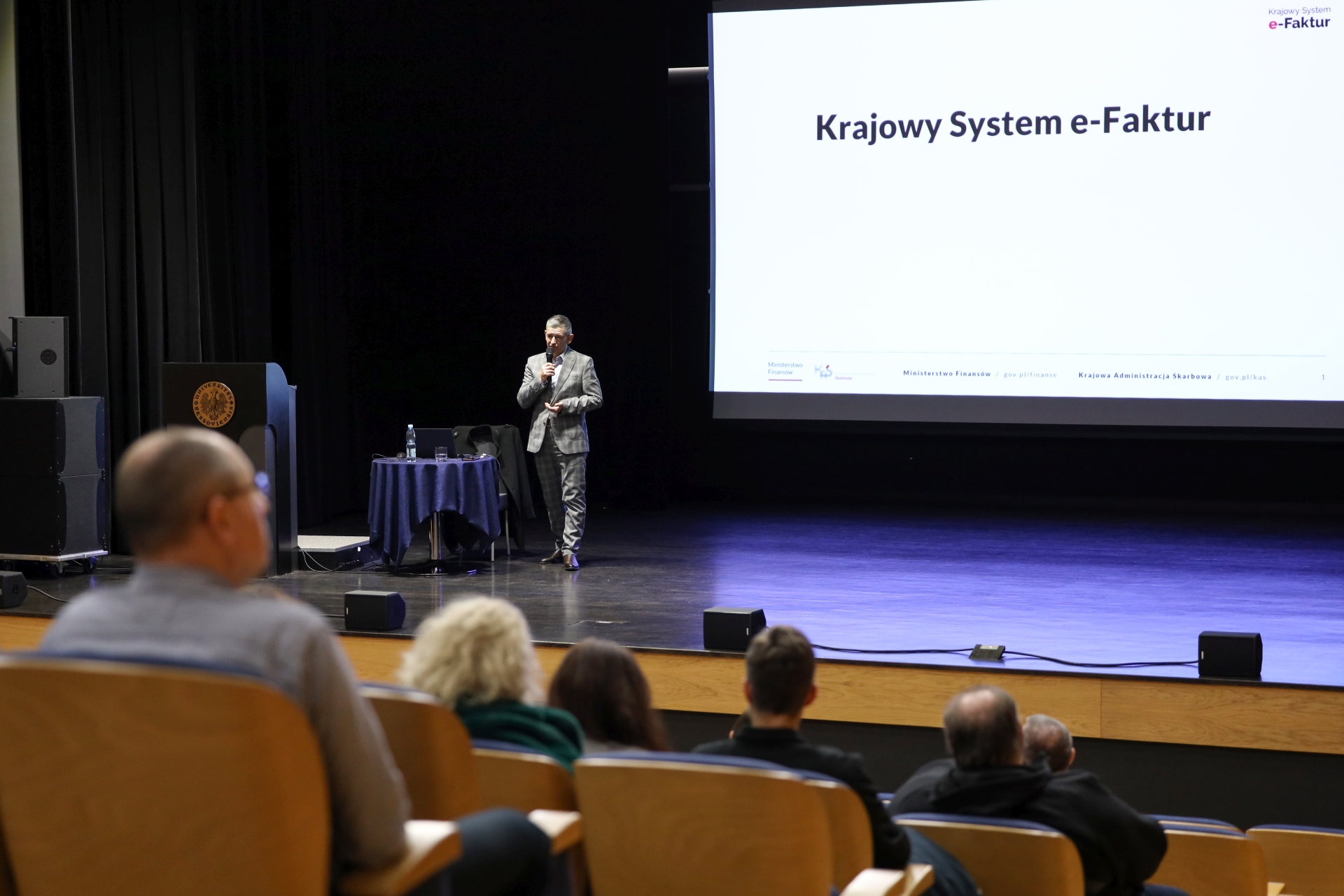 On December 1, 2025, an open lecture on the National e-Invoice System (KSeF) was held at the University of Rzeszów, organized on behalf of His Magnificence Rector Prof. Adam Reich, MD, PhD, Head of the Department of Financial Law at the Faculty of Law and Administration of the University of Rzeszów, Prof. Elżbieta Feret, PhD, and Deputy Director of the Tax Administration Chamber in Rzeszów, Mr. Piotr Bauman. -Director of the Tax Administration Chamber in Rzeszów, Mr. Piotr Bauman. The meeting for employees responsible for receiving, issuing, and settling invoices was held in the St. Jadwiga Królowa Auditorium and was opened by the Rector, who emphasized the importance of preparing the university for changes in the invoicing system.