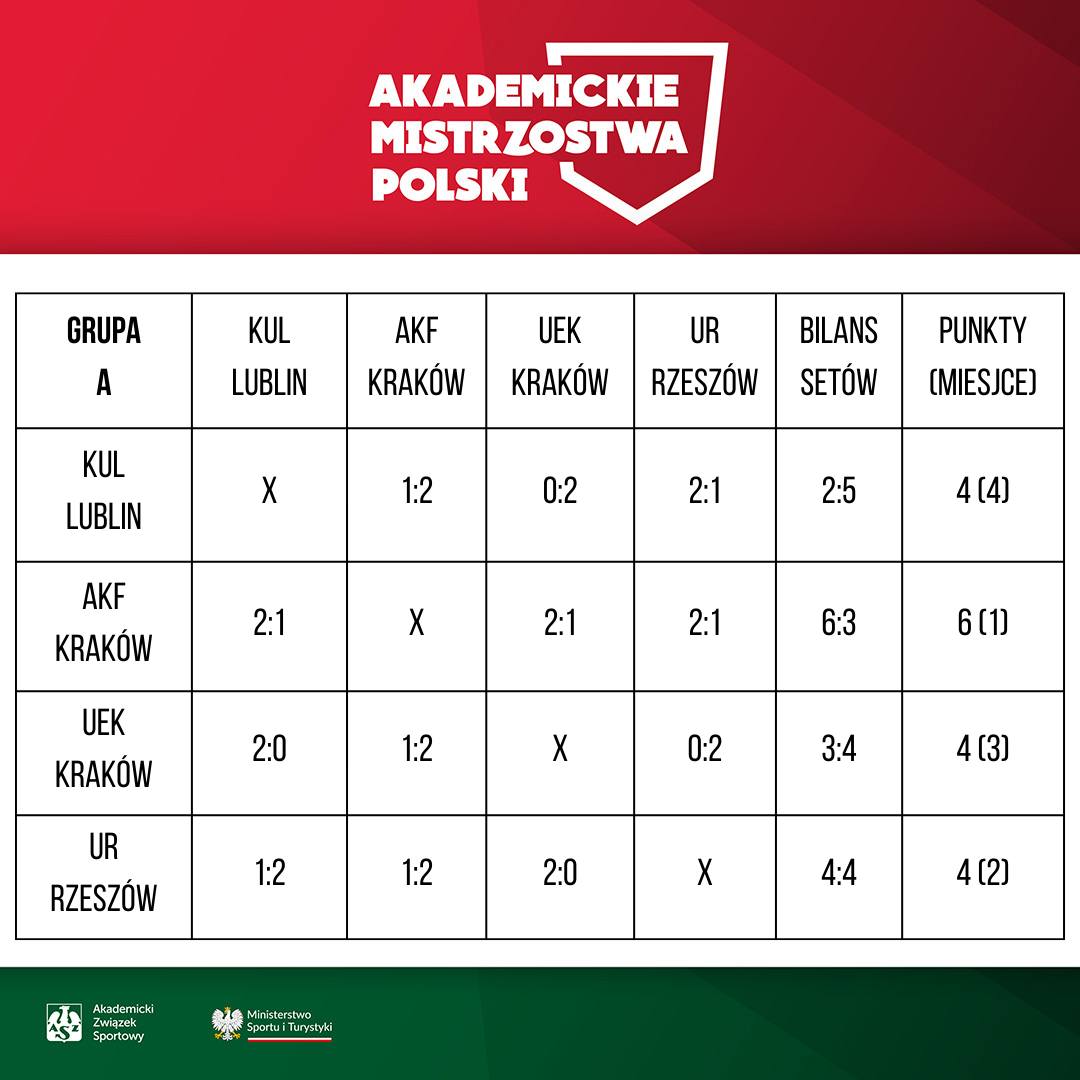 Representing the University of Rzeszów, students competed under the banner of the University Sports Club AZS UR. The tournament draw placed them in a highly competitive group, where they narrowly lost two matches—1:2 against AZS KUL Lublin and AZS AKF Kraków. However, in a decisive group-stage match, they triumphed over the host team, UEK, with a convincing 2:0 victory, securing a spot in the knockout phase.