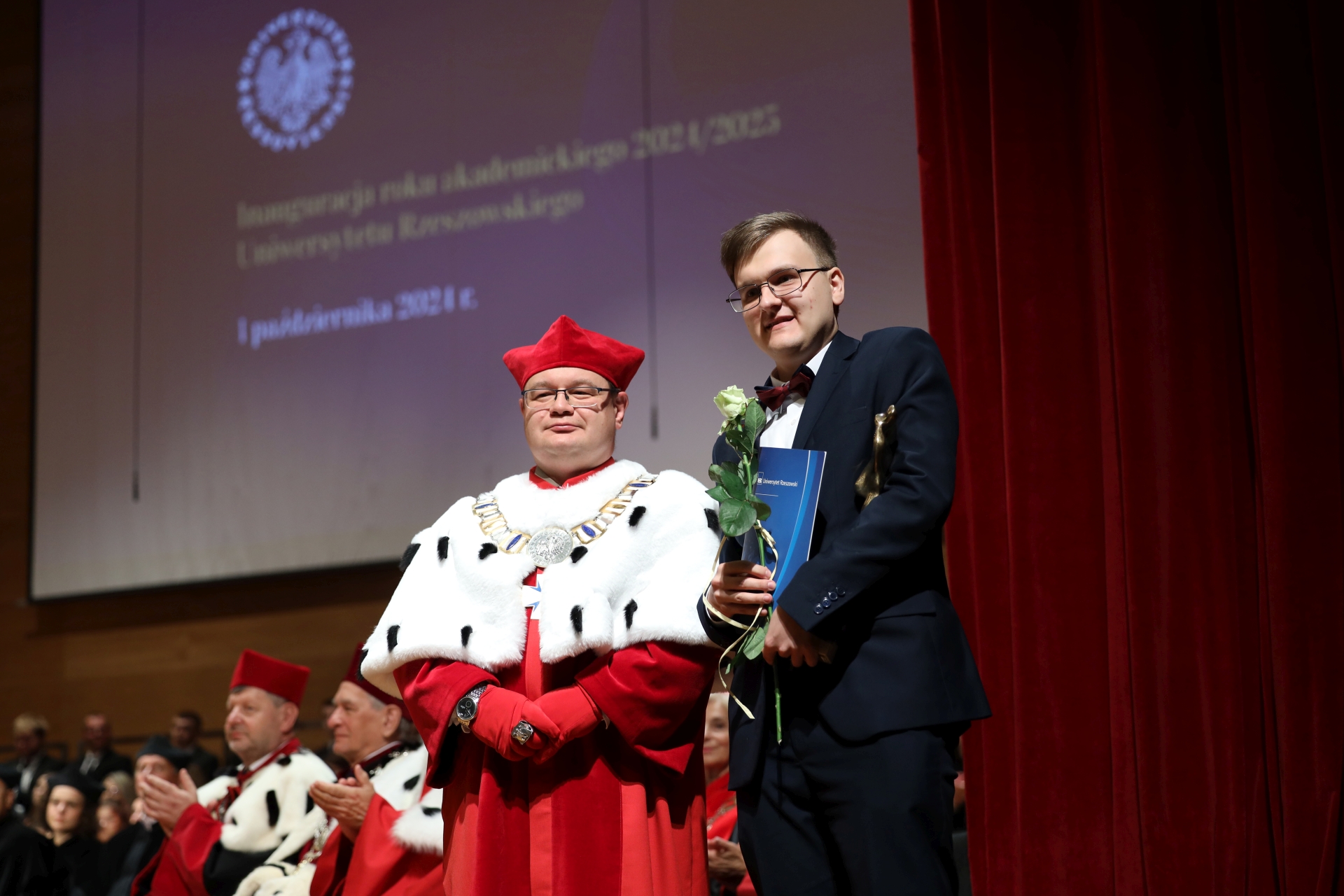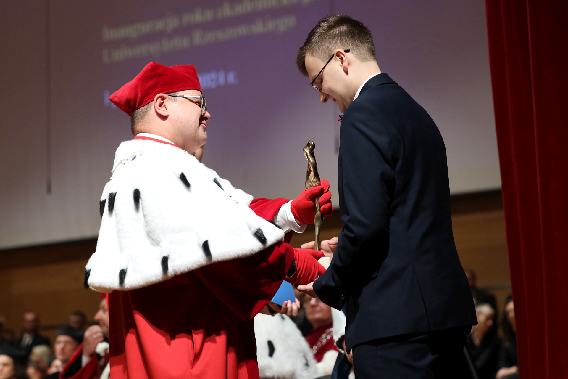 The Rector informed that as a result of the competition procedure, the best graduate of the University of Rzeszów in 2023 was selected. For the academic year 2023/2024, the statuette was awarded to a graduate of Finance and Accounting, Mr. Jan Sobuś.