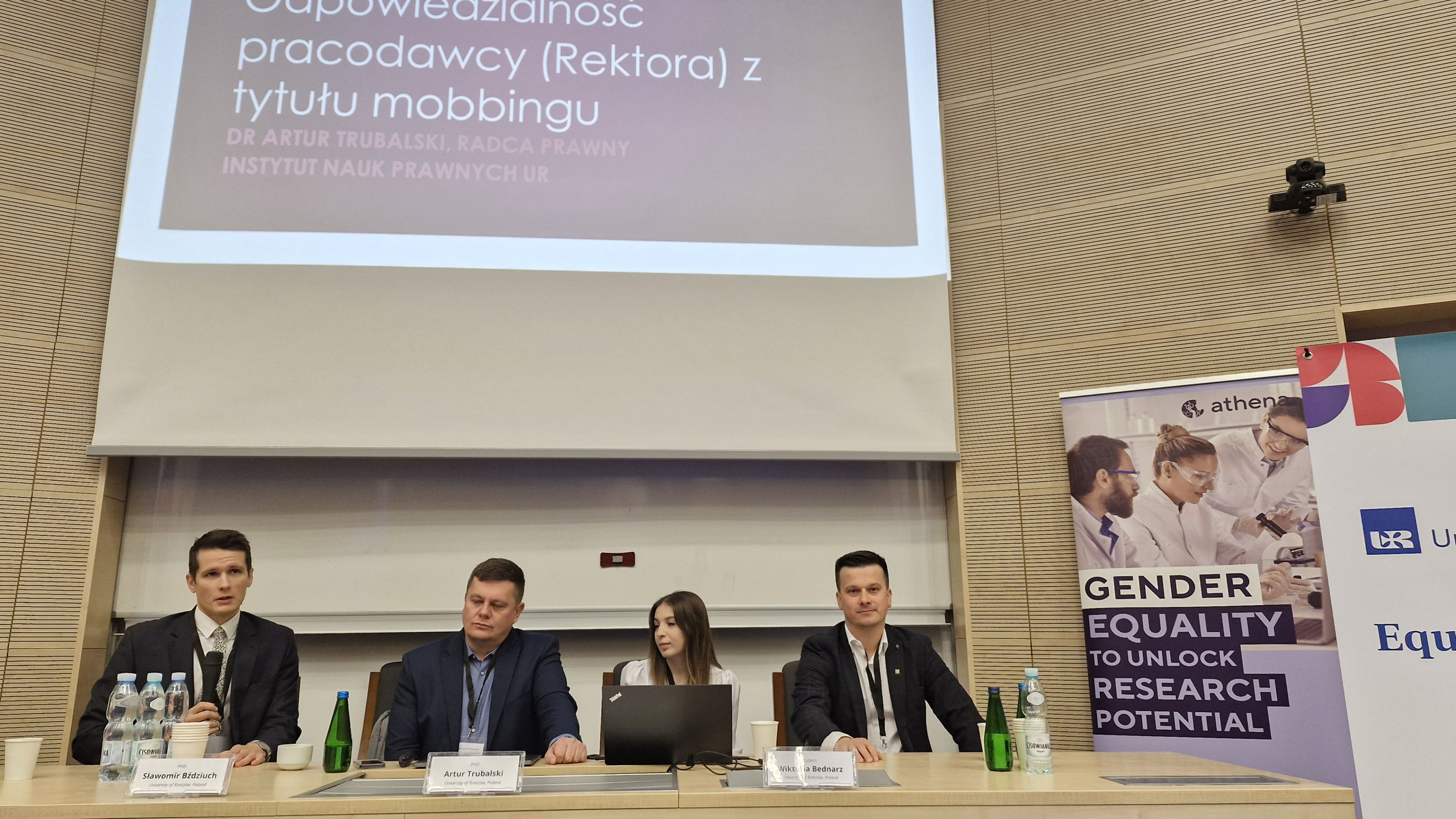 In the second thematic block, employees of the Institute of Legal Sciences of the University of Rzeszów presented their work: Dr. Wojciech Kosior (prosecutor), Dr. Agata Ludera Ruszel (judge), and Dr. Artur Trubalski (attorney-at-law). Their presentations addressed the broadly understood liability of the employer (rector) for violating provisions of labor law, civil law (on the prohibition of discrimination, counteracting mobbing, and the protection of personal rights), and criminal law provisions regarding the commission of malicious offenses or persistent violations of employee rights.
