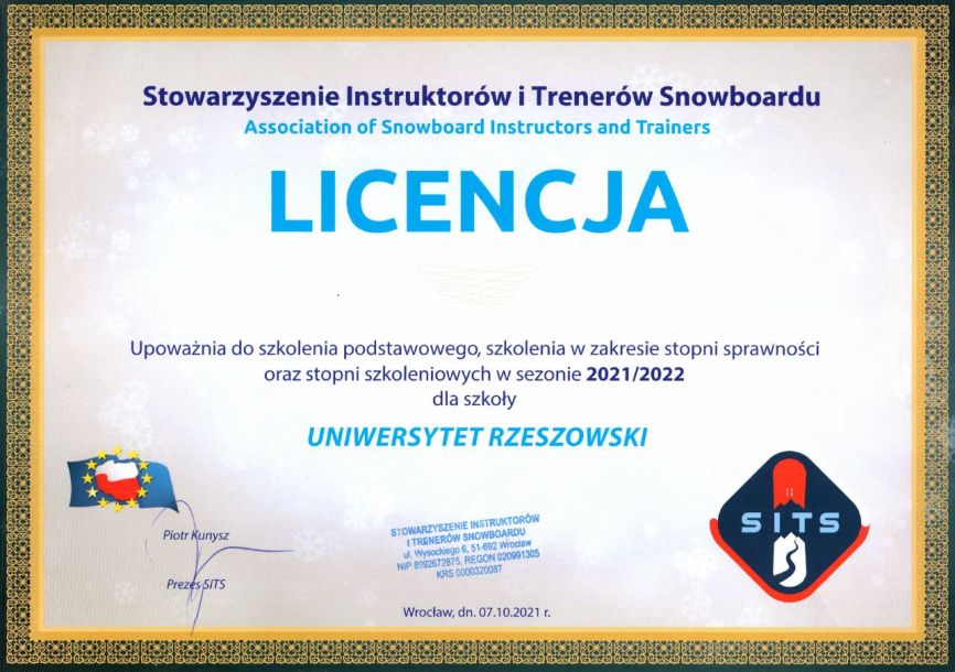 Miło nam poinformować, że nasz pracownik dr Marian Rzepko uzyskał najwyższy stopień zawodowy: Instruktora Wykładowcy Stowarzyszenia Instruktorów i Trenerów Snowboardu.