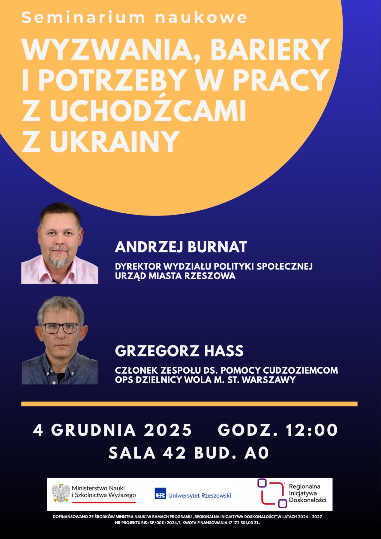 Dziekan Wydziału Nauk Społecznych dr hab. Krzysztof Żarna, prof. UR zaprasza do udziału w dniu 4 grudnia 2025 roku (godz. 12:00-13:30) w seminarium pt. „Wyzwania, bariery i potrzeby w pracy z uchodźcami z Ukrainy” (sala 42, budynek A0).