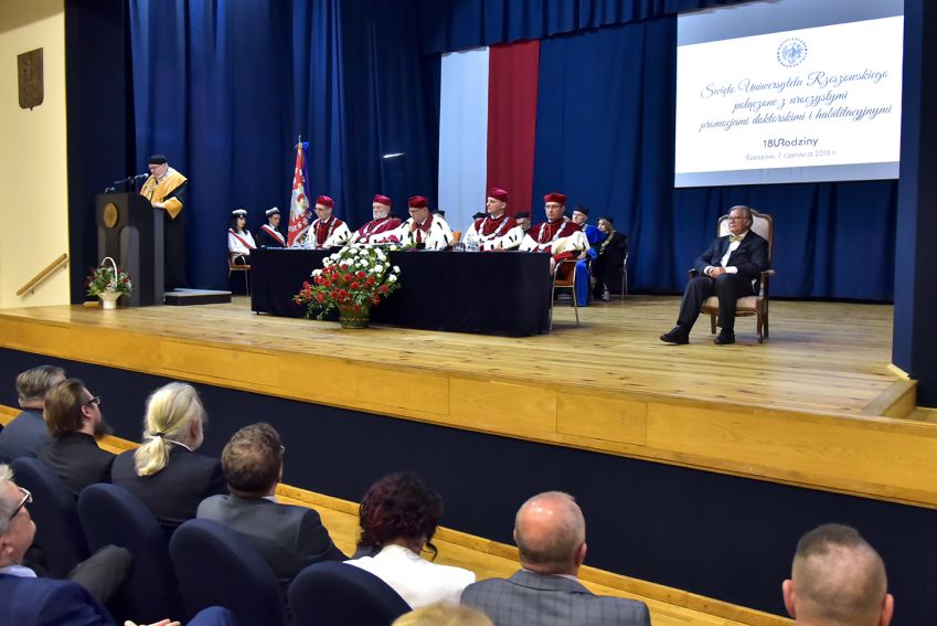 7 czerwca 2019 r. Uniwersytet Rzeszowski świętował swoje 18 urodziny. Święto było okazją do rozmów o przeszłości i przyszłości, konstatacji teraźniejszości i poszukiwania nowych dróg prowadzących w pełną sukcesów dorosłość. Uroczystość była również okazją do przeprowadzenia promocji doktorskich i habilitacyjnych oraz wręczenia odznaczeń państwowych i nagród JM Rektora.