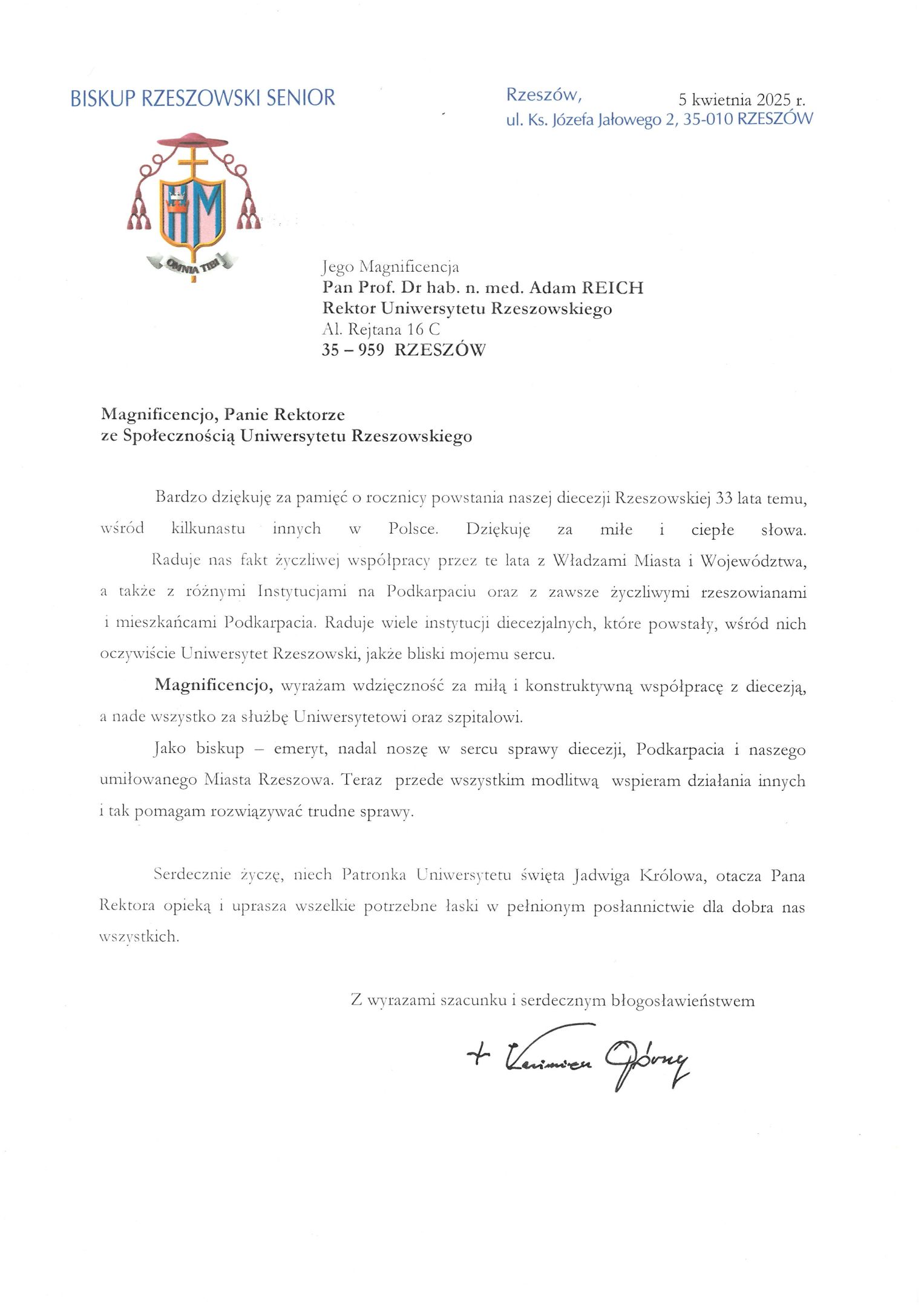 Z okazji pięknego Jubileuszu 33 lecia Diecezji Rzeszowskiej, w imieniu społeczności akademickiej Uniwersytetu Rzeszowskiego składam na ręce Jego Ekscelencji Biskupa najserdeczniejsze życzenia.