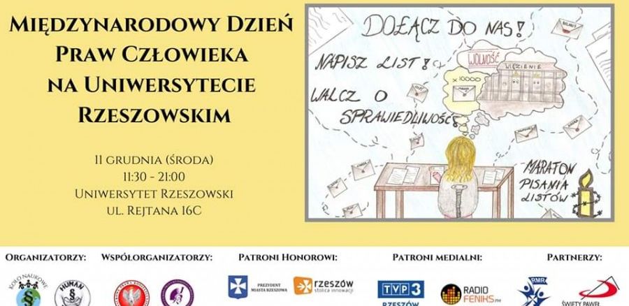 Podczas Maratonu będziemy pisać ws. młodych osób z 10 państw, których prawa człowieka zostały złamane. Gospodarzami tego wydarzenia są: Koło Naukowe „Paragraf”, Koło Naukowe „Human Rights”, Koło Naukowe Prawa Rzymskiego i Porównawczego „Ius Romanorum”. Naszym partnerem jest Rada Młodzieży Rzeszowa, Księgarnia Św. Pawła