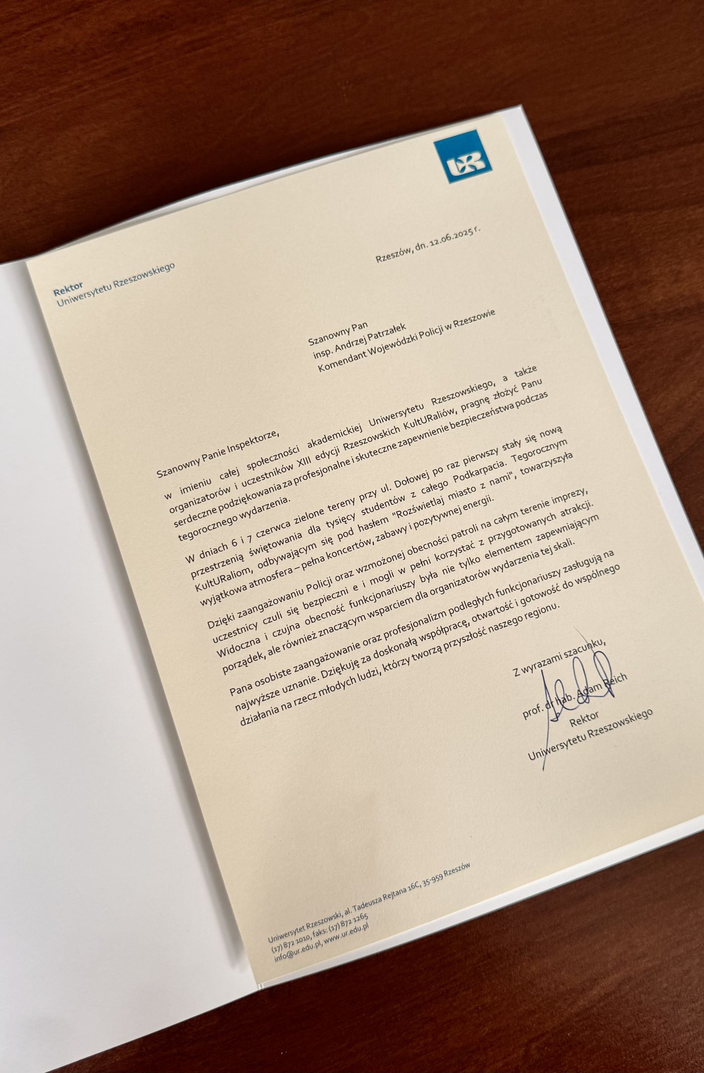 W dniu 12 czerwca 2025 r. Jego Magnificencja Rektor Uniwersytetu Rzeszowskiego prof. dr hab. Adam Reich spotkał się z insp. Andrzejem Patrzałkiem, Komendantem Wojewódzkim Policji w Rzeszowie. Celem spotkania było wyrażenie podziękowania za profesjonalne wsparcie oraz skuteczne działania podjęte przez Policję podczas tegorocznej edycji Rzeszowskich KultURaliów.