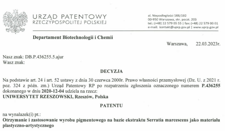 Urząd Patentowy RP przyznał patent na wynalazek powstały w ramach współpracy Instytutu Biotechnologii UR oraz Instytutu Sztuk Pięknych UR
