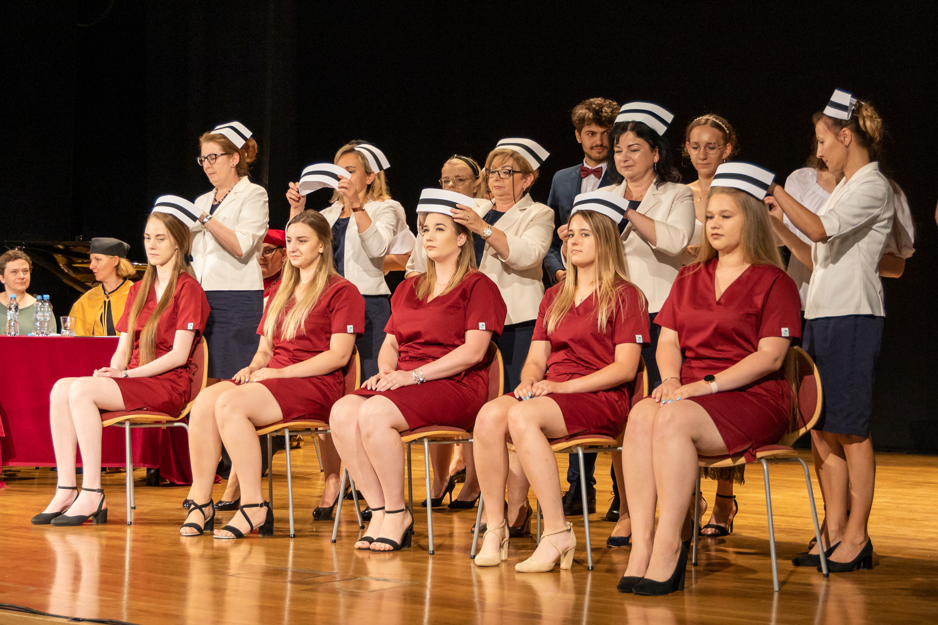 Kulminacyjnym punktem uroczystości było nałożenie symbolicznych czepków studentom przez: mgr Anetę Lesiak – Opiekuna III roku – absolwentów, dr n o zdr. Zdzisławę Chmiel – Kierownika Kierunku Pielęgniarstwo, dr n.med. Małgorzatę Marć – Prodziekana Kolegium Nauk Medycznych; mgr Elżbietę Sułyk i mgr Anitę Drążek. Po otrzymaniu symbolicznych czepków absolwenci złożyli zawodowe przyrzeczenie i odśpiewali hymn pielęgniarski.