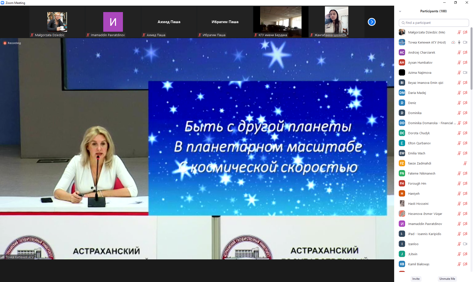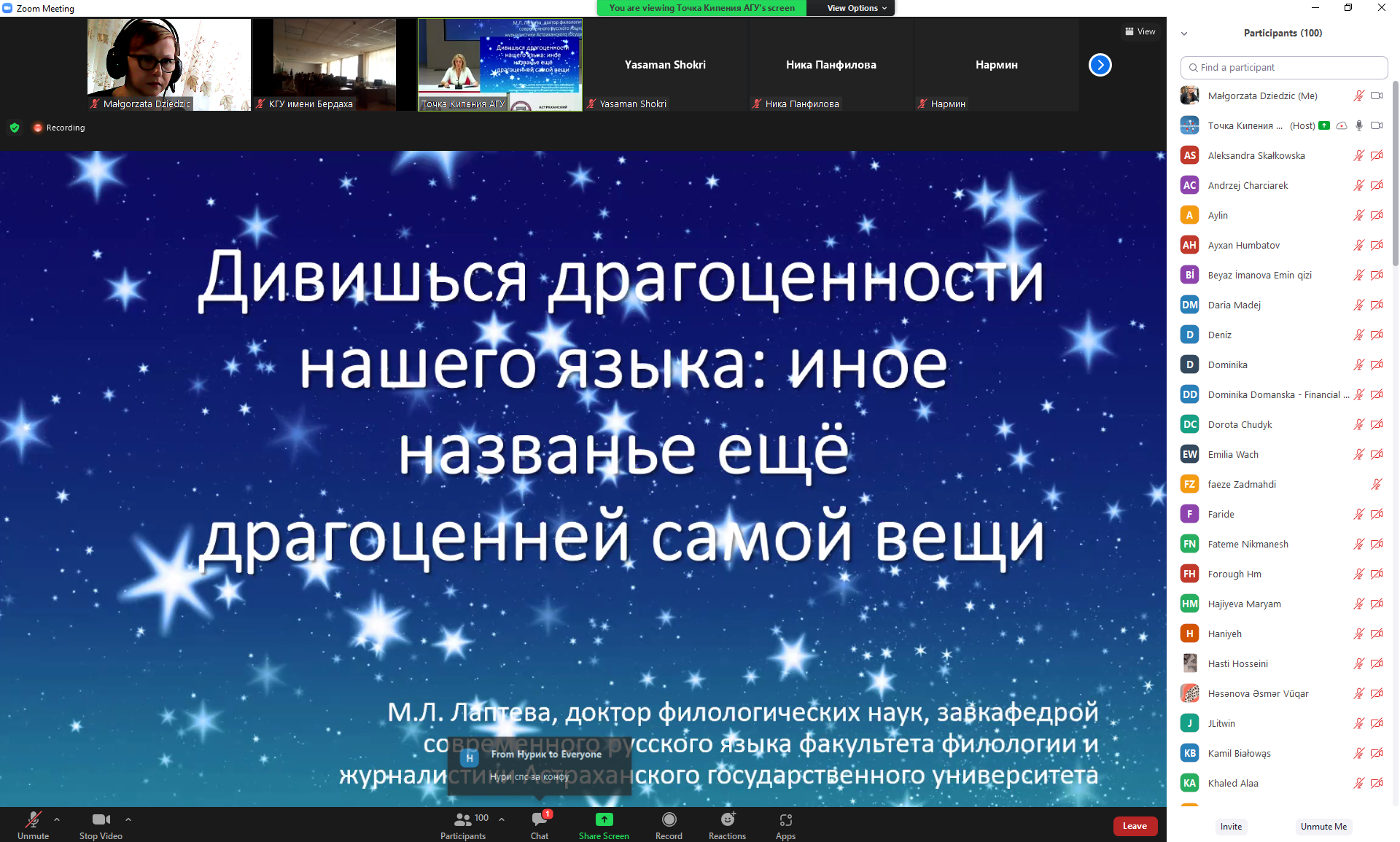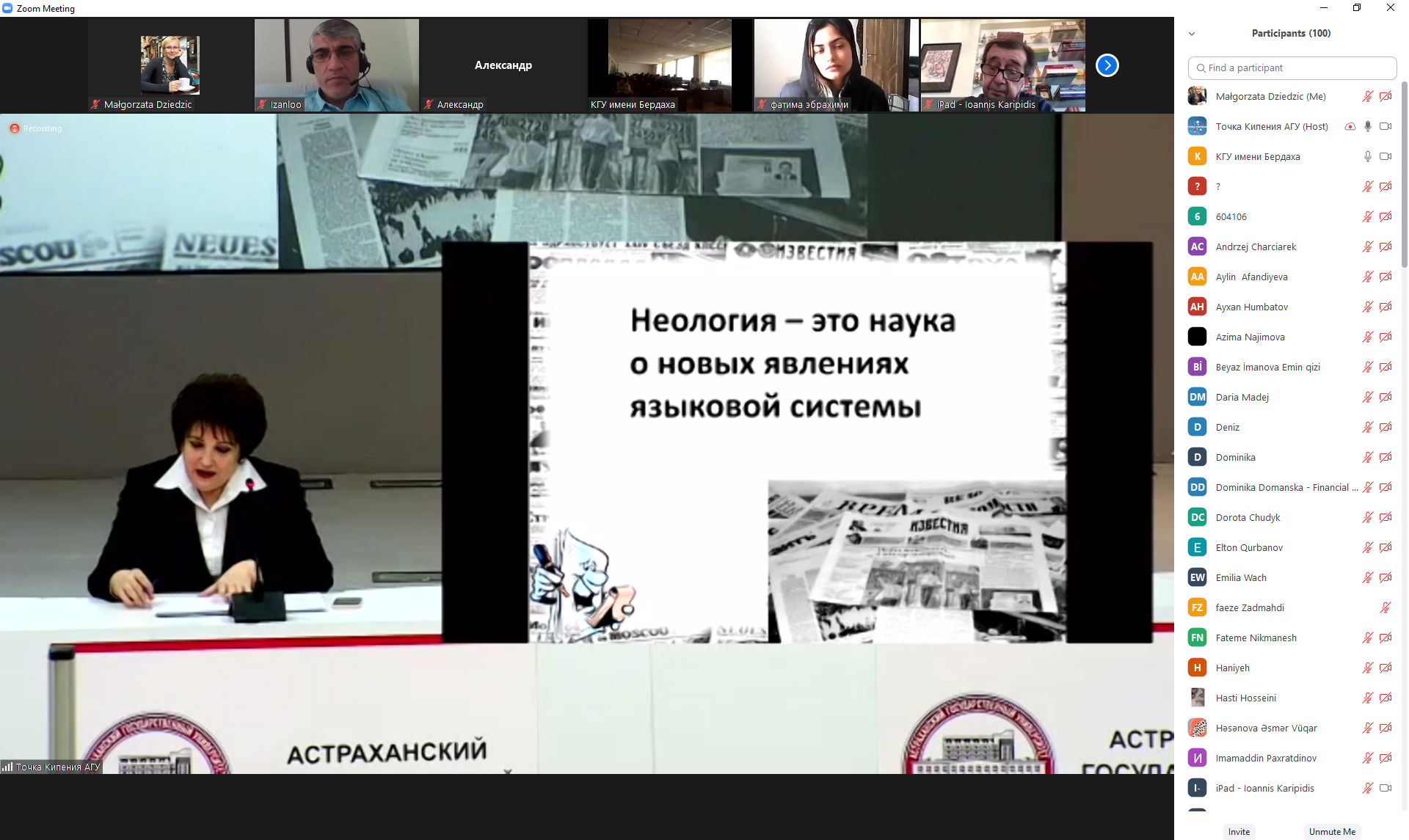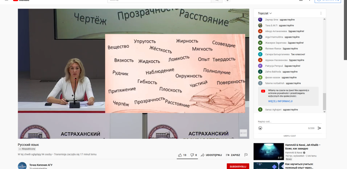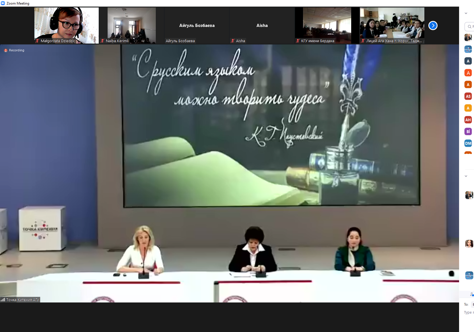 Wykładowcy Wydziału Filologii i Dziennikarstwa Astrachańskiego Uniwersytetu Państwowego opowiadali licznie zgromadzonej publiczności uczestniczącej w spotkaniu za pośrednictwem platformy ZOOM oraz transmisji na kanale YouTube o tegorocznych jubileuszach wybitnych pisarzy, których potencjał twórczy wzbogacił język rosyjski o nowe słownictwo, a także o dynamicznych zmianach, jakie zachodzą w języku rosyjskim w ostatnich latach i przestrzeni językowej Internetu.