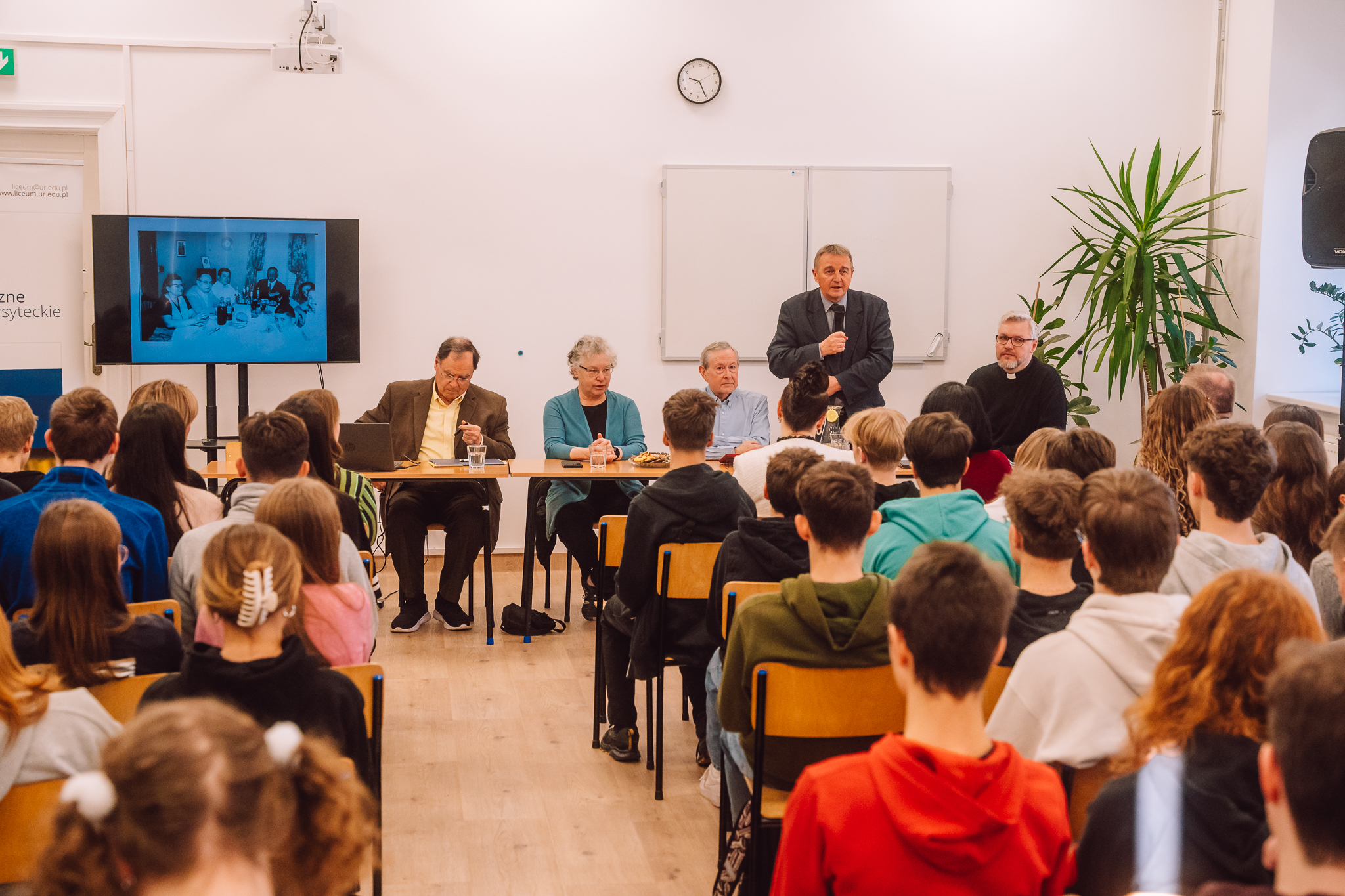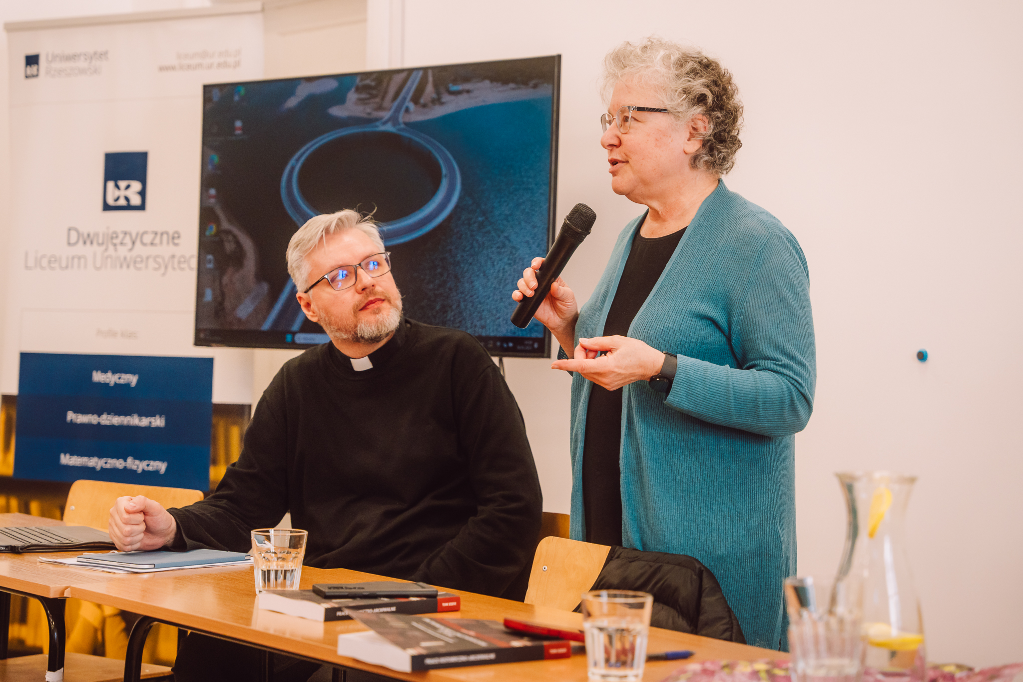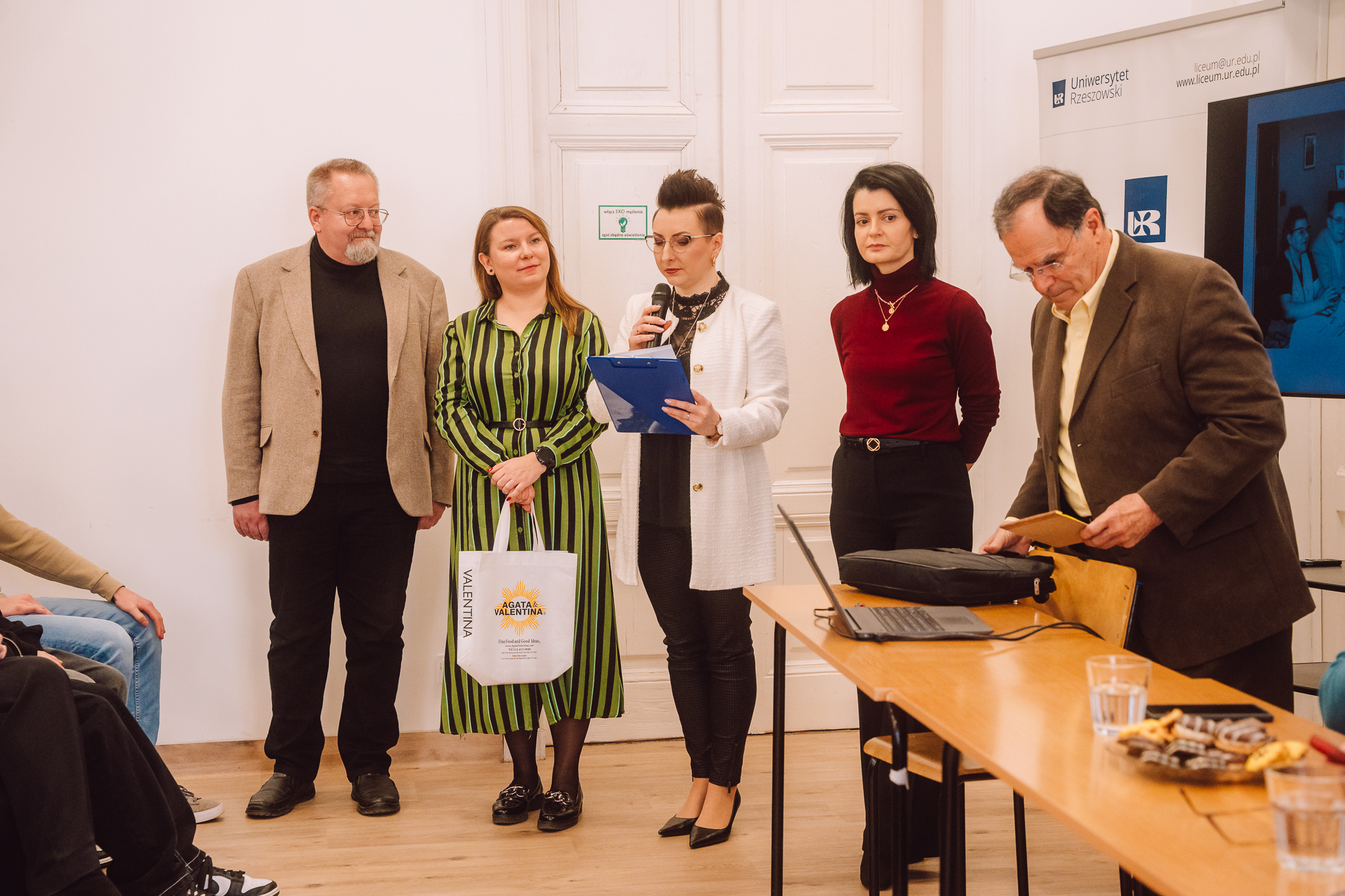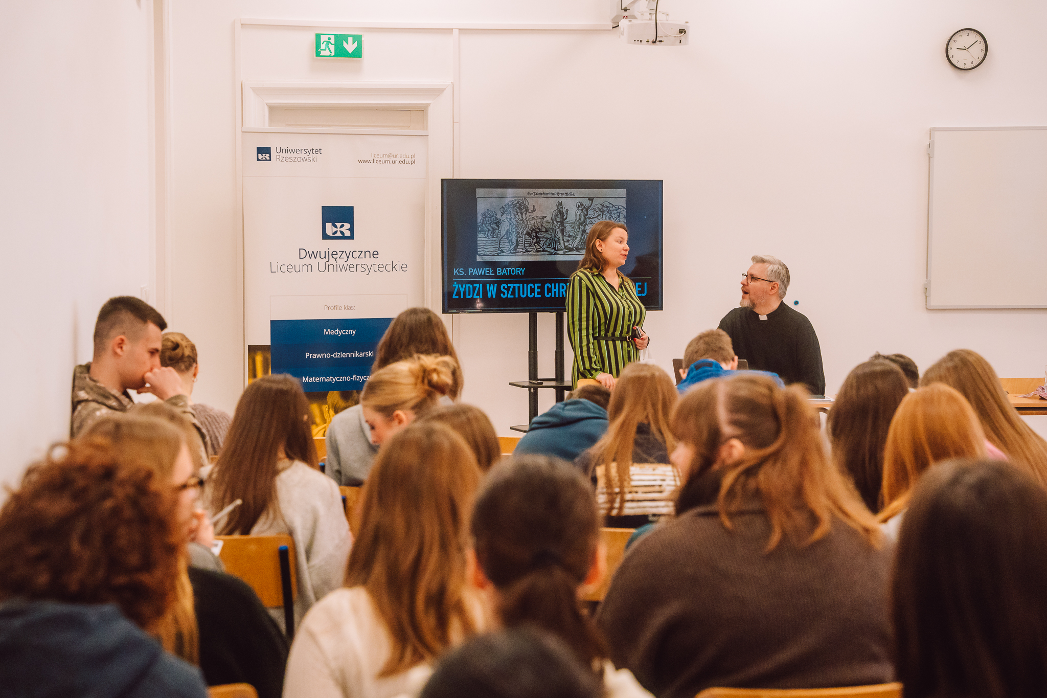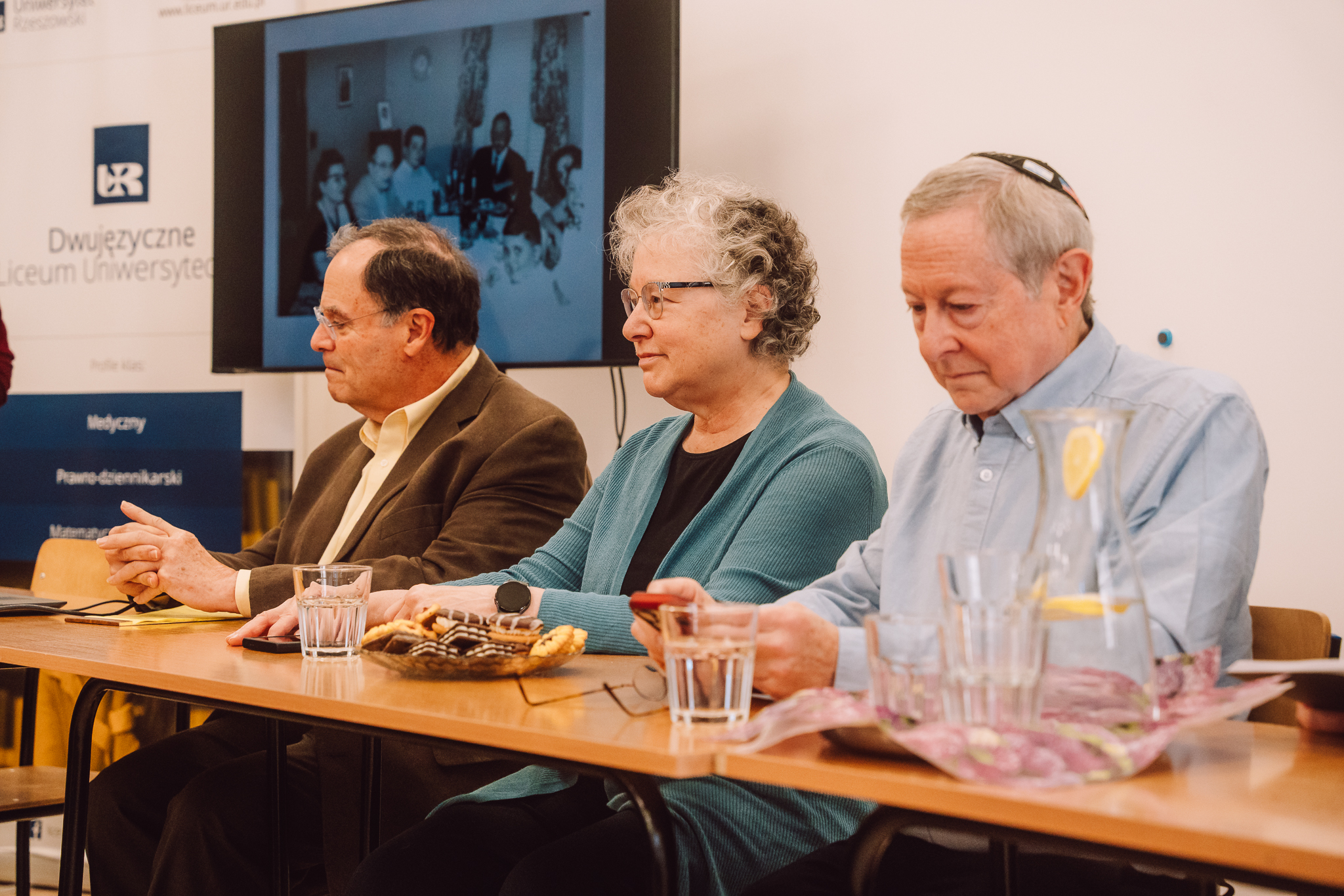 Uczestników spotkania przywitali: współorganizator obchodów Dnia Pamięci o Ofiarach Holokaustu na Podkarpaciu – dr hab. prof. UR Wacław Wierzbieniec, dyrektor Dwujęzycznego Liceum Uniwersyteckiego – dr Anna Pięta-Szawara, wicedyrektorzy DLU – mgr Monika Towarnicka oraz mgr Stanisław Dołęga, a także mgr Marta Wójcik, rzeszowska społeczniczka, znawczyni i pasjonatka tematyki żydowskiej, zawodowo związana z Liceum. Historie opowiedziane przez gości – o bohaterskich postawach osób, które w czasach II wojny światowej ratowały swoich bliskich, niosąc pomoc, często ryzykując przy tym własne życie – na zawsze pozostaną w sercach i umysłach uczestników spotkania. Było to nie tylko głębokie doświadczenie historyczne, ale i niezwykłe świadectwo pamięci.
