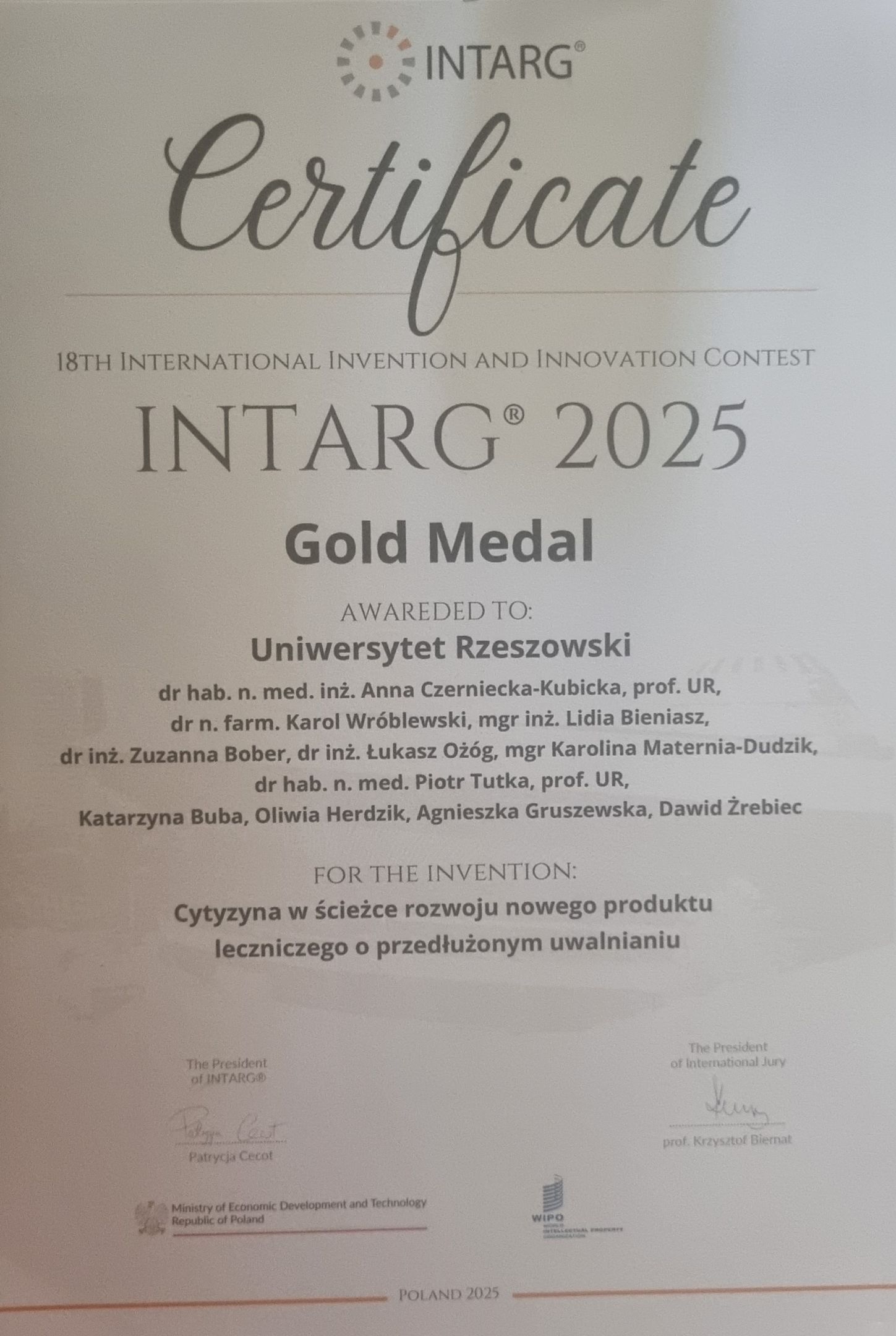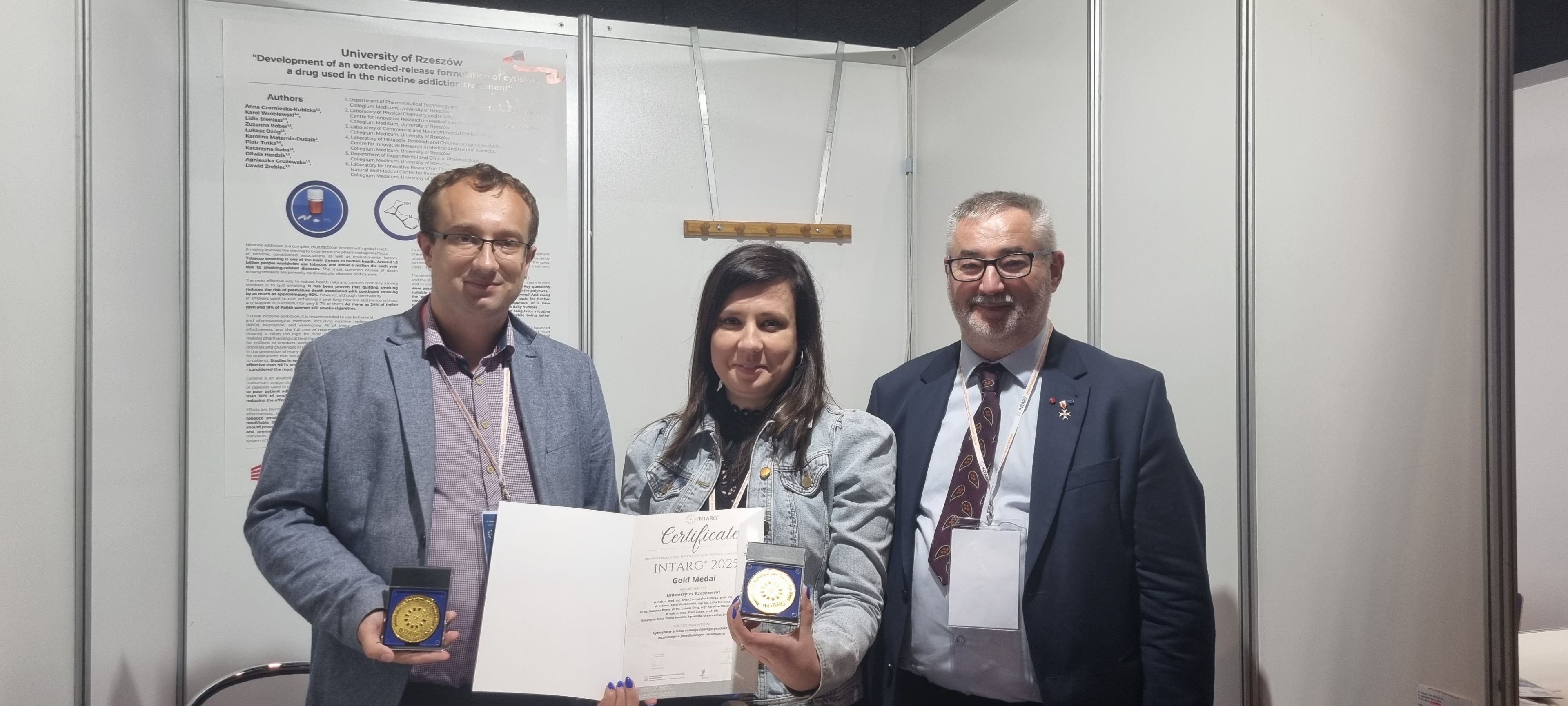 Z przyjemnością informujemy, że Pracownicy Wydziału Medycznego Collegium Medicum zdobyli złoty medal na XVIII Międzynarodowych Targach Wynalazków i Innowacji INTARG® 2025 za wynalazek „Cytyzyna w ścieżce rozwoju nowego produktu leczniczego o przedłużonym uwalnianiu” w kategorii „ZDROWIE - MEDYCYNA”.