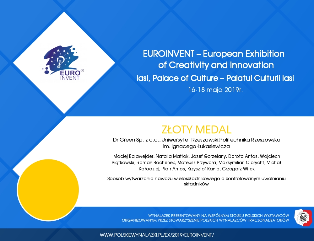 16-18 maja 2019 r. podczas międzynarodowej wystawy innowacji „EUROINVENT – European Exhibition of Creativity and Innovation” zaprezentowano wytworzony w ramach projektu pt. „Opracowanie innowacyjnych nawozów na bazie alternatywnego źródła surowca” nr 270963, współfinansowanego ze środków publicznych będących w dyspozycji Narodowego Centrum Badań i Rozwoju w ramach Programu „ŚRODOWISKO NATURALNE, ROLNICTWO I LEŚNICTWO” – BIOSTRATEG wynalazek „Sposób wytwarzania nawozu wieloskładnikowego o kontrolowanym uwalnianiu składników” (zgłoszenie patentowe nr P.429318), który został nagrodzony złotym medalem.