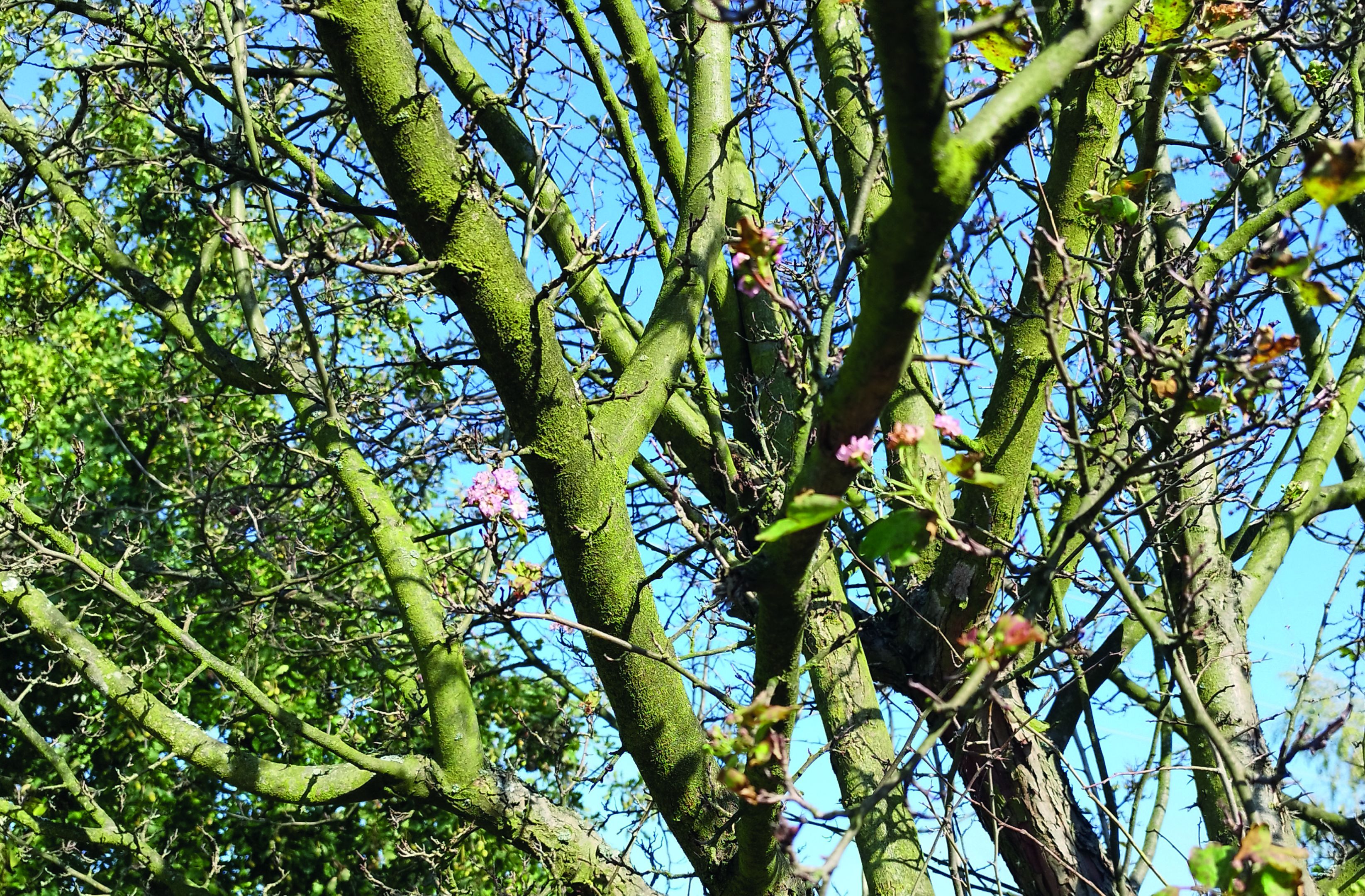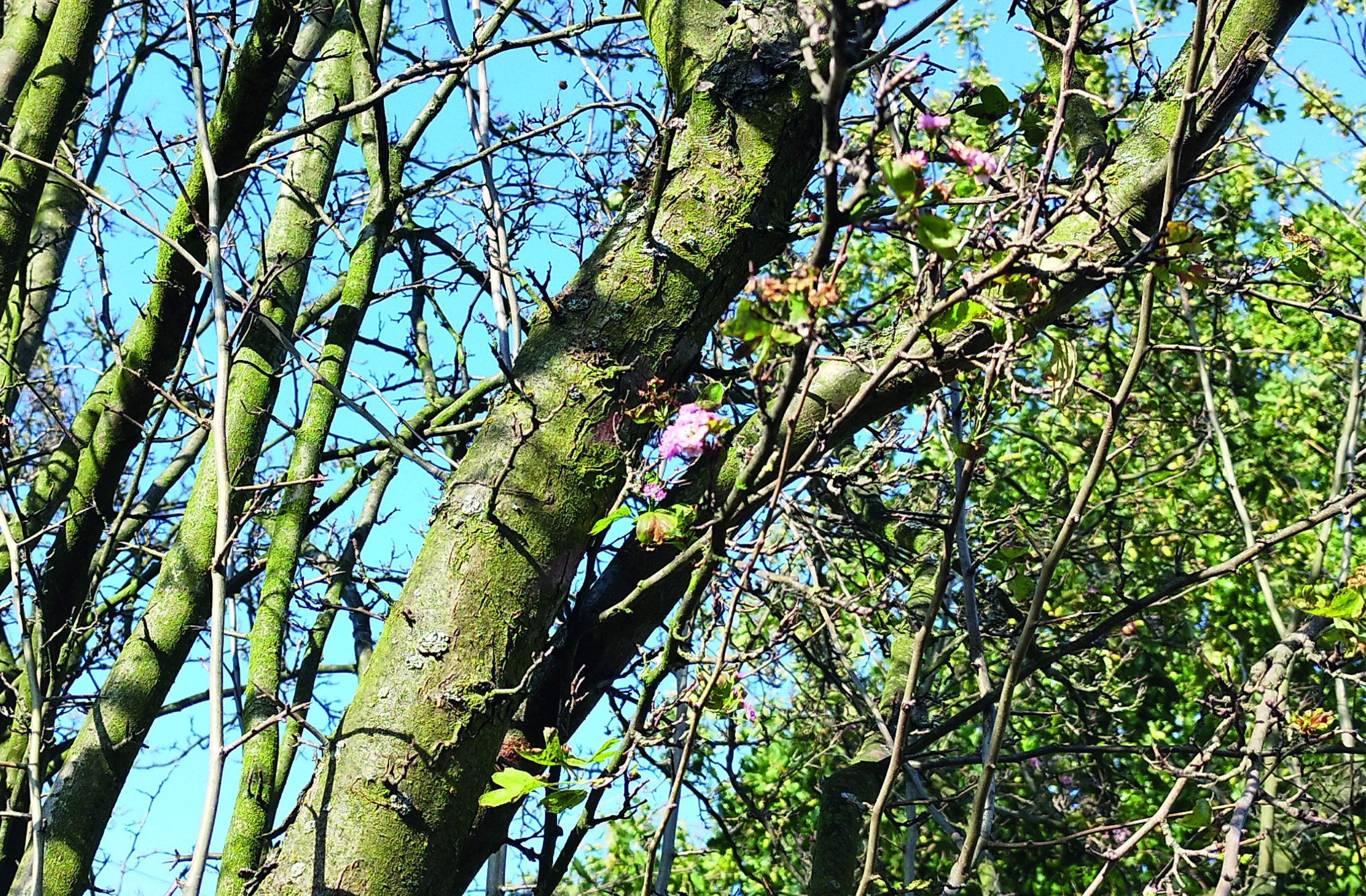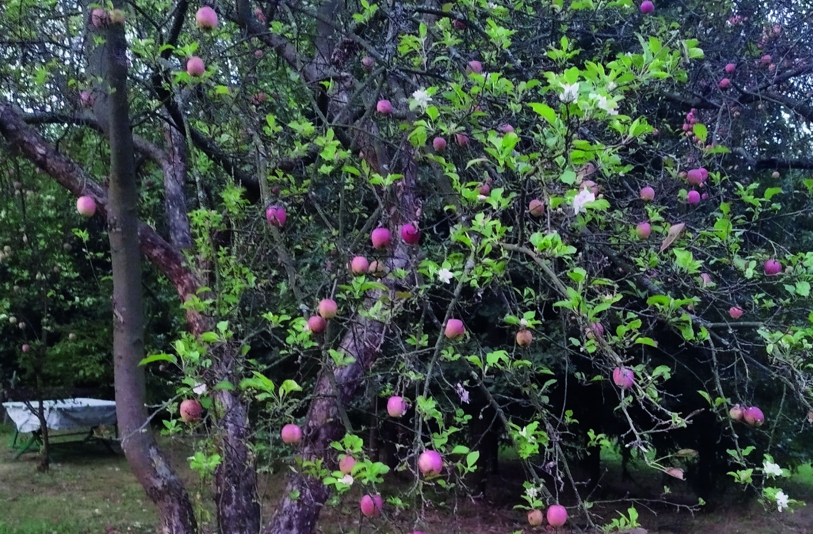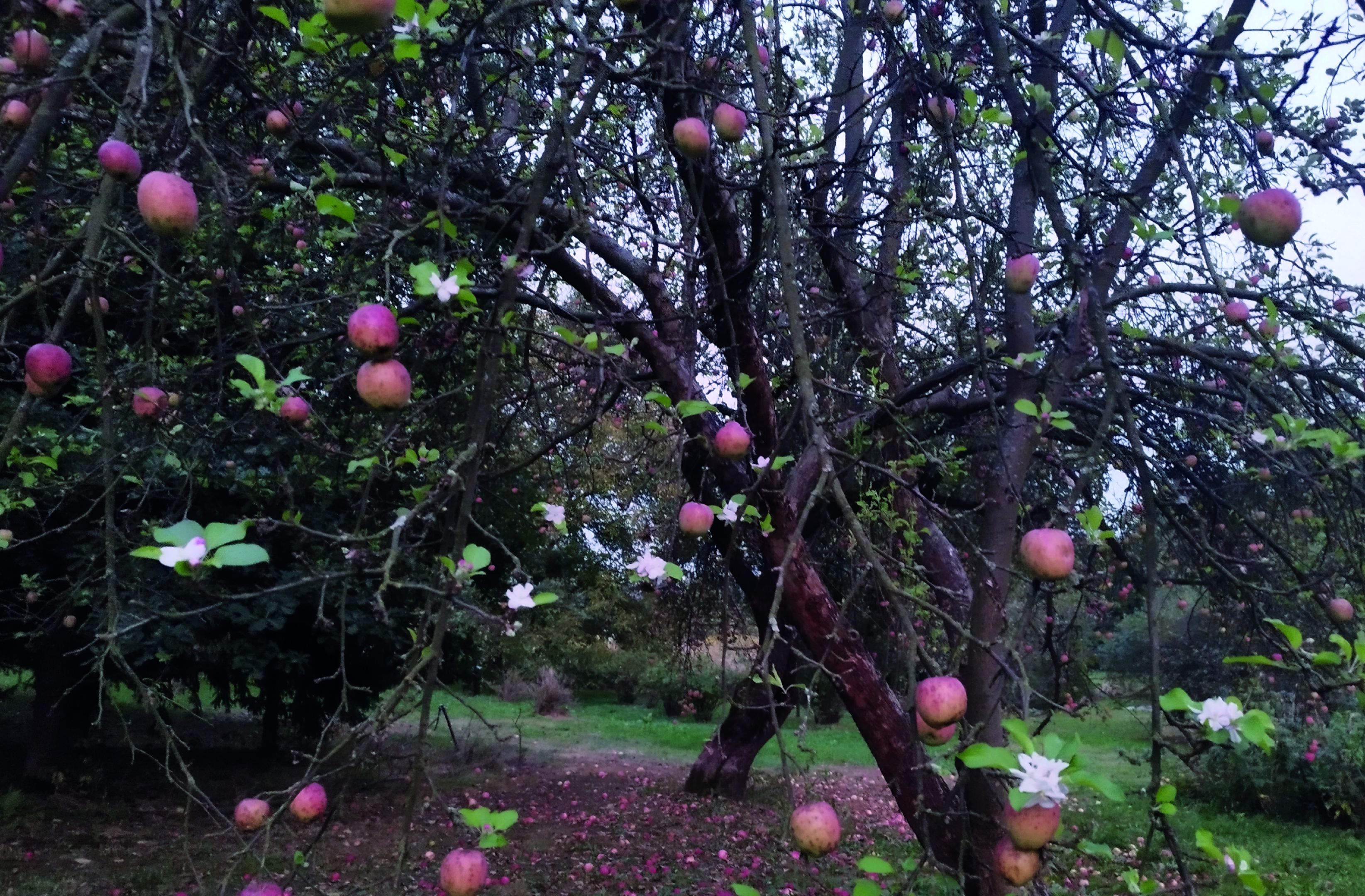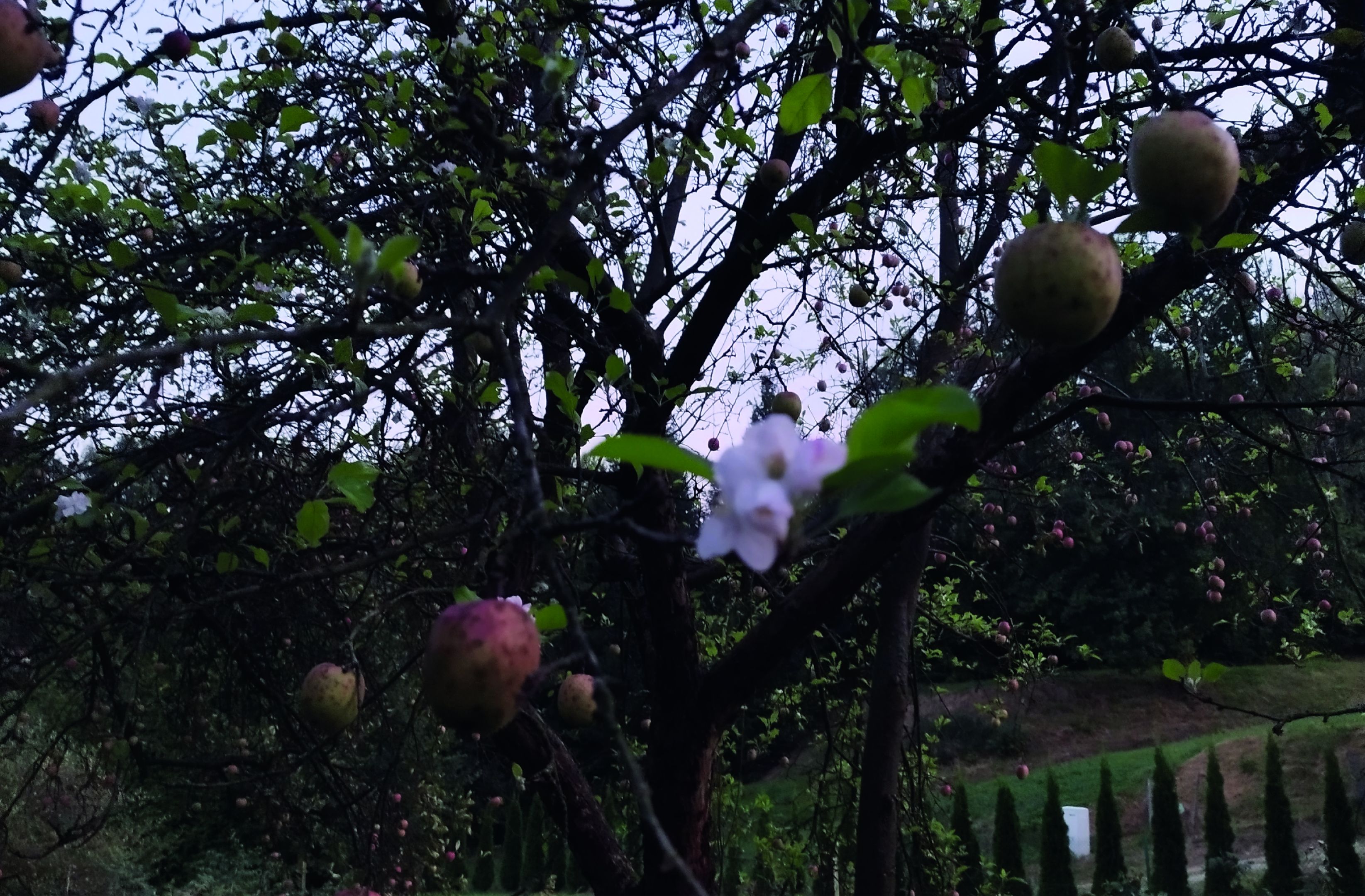 To nie fotomontaż - drzewa w dwóch fazach fenologicznych Jabłoń - dojrzewanie owoców i kwitnienie (Balice 07.09.2024)Głóg ozdobny - zmiana barwy liści i kwitnienie (Krasne 24.09.2024)