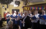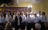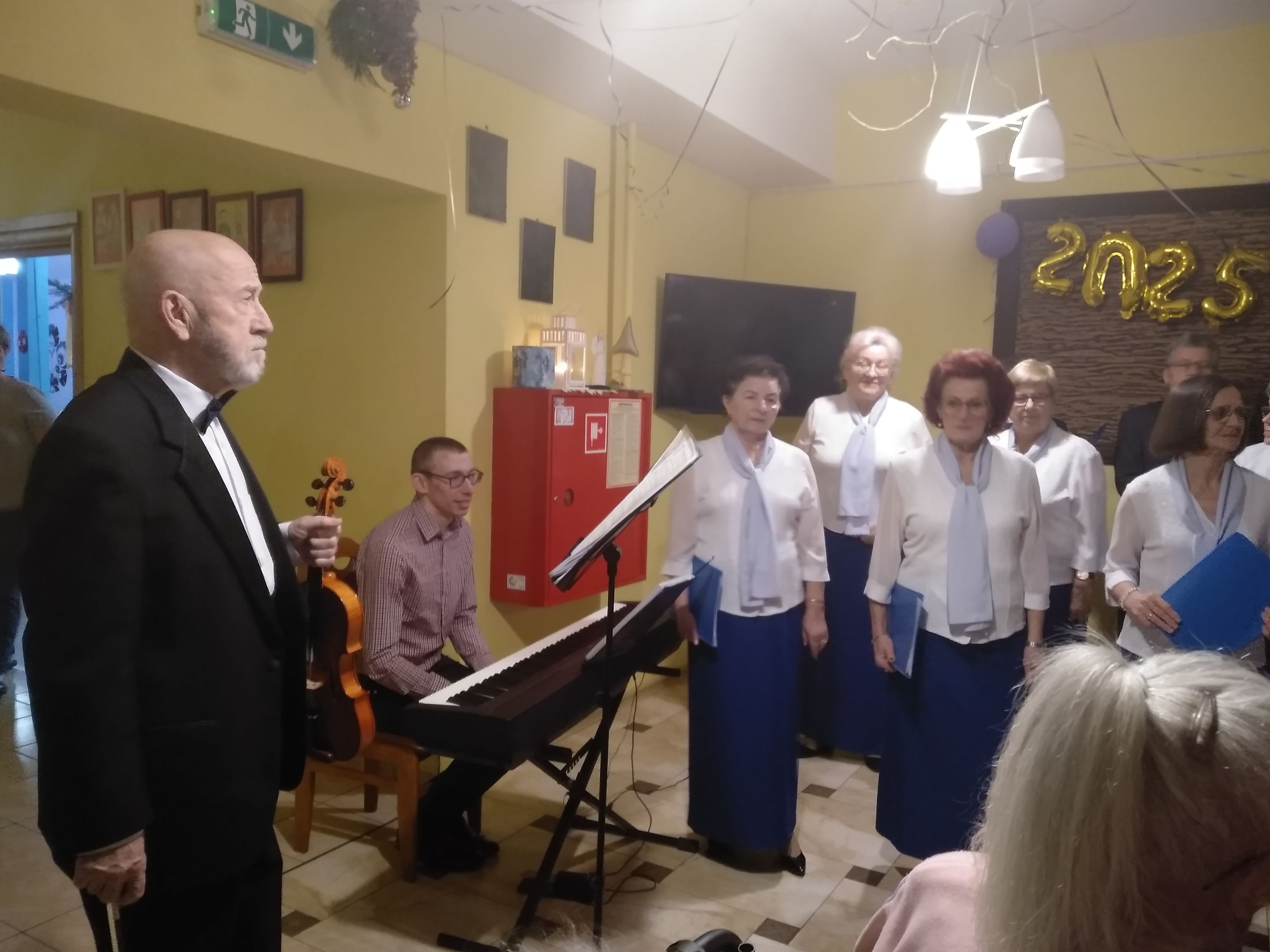 "O gwiazdeczko" i  "Cicha noc nad Palestyną". Odbiór widowni był spontaniczny - znane kolędy nucili wszyscy, natomiast w te nieznane wsłchuchiwali się z uwagą.   Koncert podsumowaliśmy życzeniami noworocznymi, wyrażonymi słowami "Pieśni zimowej". Na bis wykonaliśmy „Bóg się rodzi”, na co sala zareagowała wspólnym gromkim śpiewem – mieszkańcy, personel i chórzyści połączyli siły, tworząc jedną wielką rodzinę. Miłą atmosferę tego spotkania zawdzięczamy gospodarzom i mieszkańcom DPS, którzy zawsze przyjmują nas serdecznie, jak i dyrygentce chóru - Bożenie Słowik, która potrafi szybko nawiązać przyjazne relacje z publicznością i pobudzić ją do wspólnego kolędowania. To, że koncert się podobał, zawdzięczamy naszym akompaniatorom: Ryszardowi Pichowi (pianino) i Jerzemu Kokoszce (skrzypce). Solowe wykonanie na skrzypcach fragmentu pastorałki "O gwiazdeczko" było tak przejmujące, że niejednej osobie zakręciła się łza w oku.