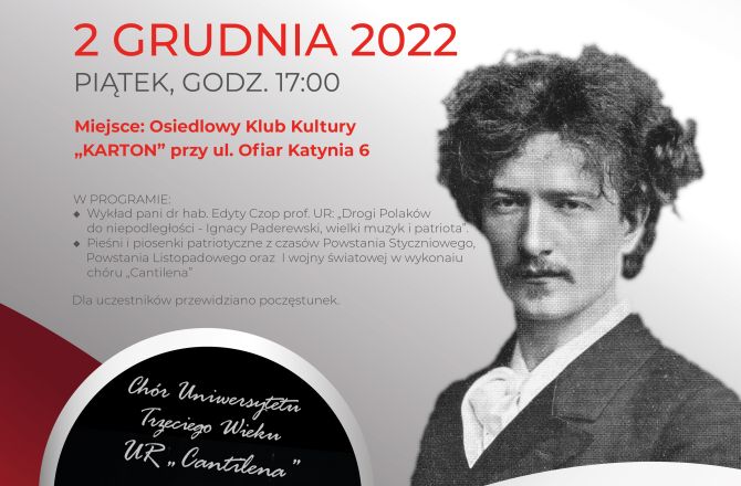 W ramach projektu SP UTW „Drogi Polaków do niepodległości - Ignacy Paderewski, wielki muzyk i patriota”, koncert chóru "Cantilena" pieśni i piosenek patriotycznych oraz wykład dr hab. prof.UR Edyty Czop.