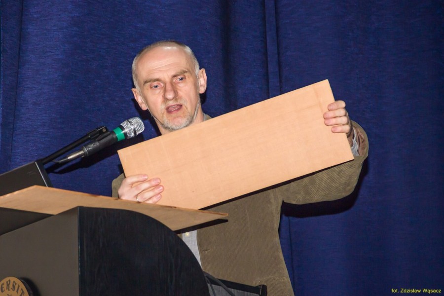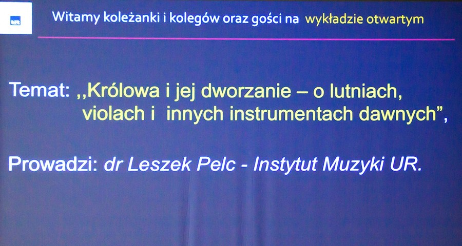 18 lutego br. wysłuchaliśmy ciekawego wykładu otwartego pt. ,,Królowa i jej dworzanie - o lutniach, violach i innych instrumentach dawnych", wygłosił go dr Leszek Pelc z Instytutu Muzyki UR. Prowadzący to nie tylko naukowiec, miłośnik muzyki i instrumentów, ale także własnoręcznie zbudował kilka lutni. W czasie wykładu przekazał ciekawe informacje z historii tych instrumentów. Przedstawił, jak zmieniały się kształty i budowa instrumentów strunowych. Zaprezentował również nagrania ilustrujące jak one brzmiały. Pokazał szczegóły ich wnętrz, ornamenty, wyszukane materiały. Czystość i barwa dźwięków zależy od kształtu i materiału, z którego instrument jest wykonany. A w fazie projektowania niezbędna jest wiedza matematyczna i dokładność geometrii oraz precyzja drobnych stroików. Pokazał materiał, z którego aktualnie buduję swoją kolejną violę.