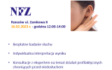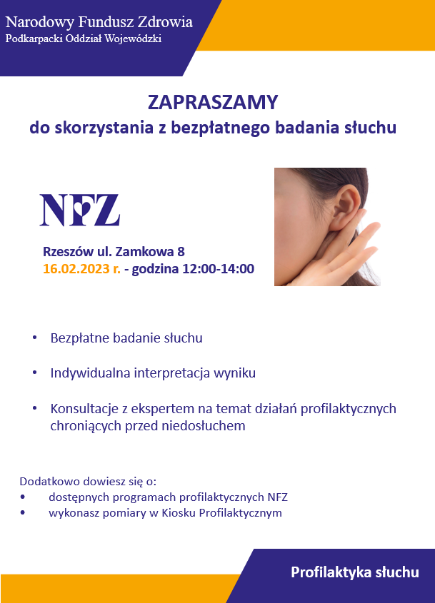 - 16 lutego w godzinach od 12:00 do 14:00 każda zgłaszająca się osoba będzie miała możliwość skorzystania z bezpłatnego badania słuchu. Test słuchu, zostanie przeprowadzony za pomocą urządzenia zwanego – audiometrem. Badanie jest bezbolesne i trwa kilka minut. Poprzedzone otoskopią ucha, polega na wyznaczeniu progu słyszalności. Pozwala określić rodzaj niedosłuchu i głębokość jego upośledzenia.