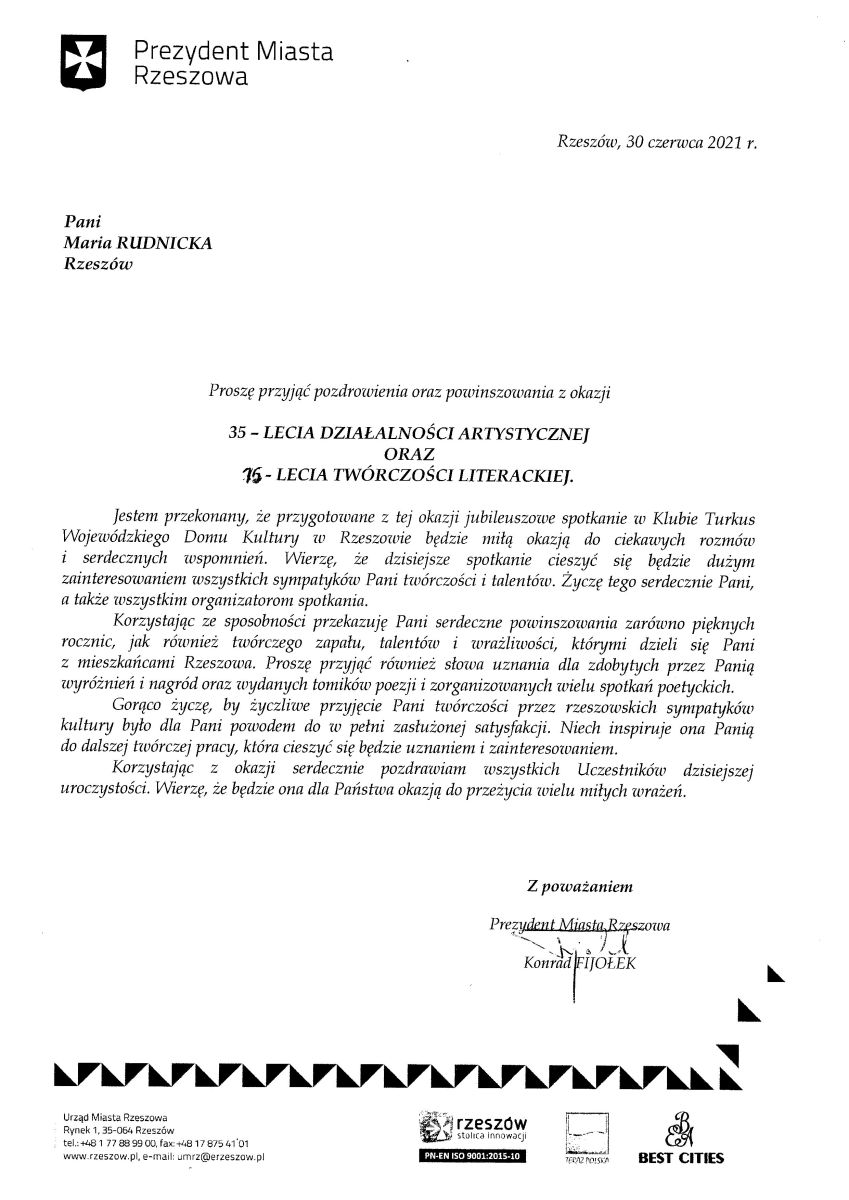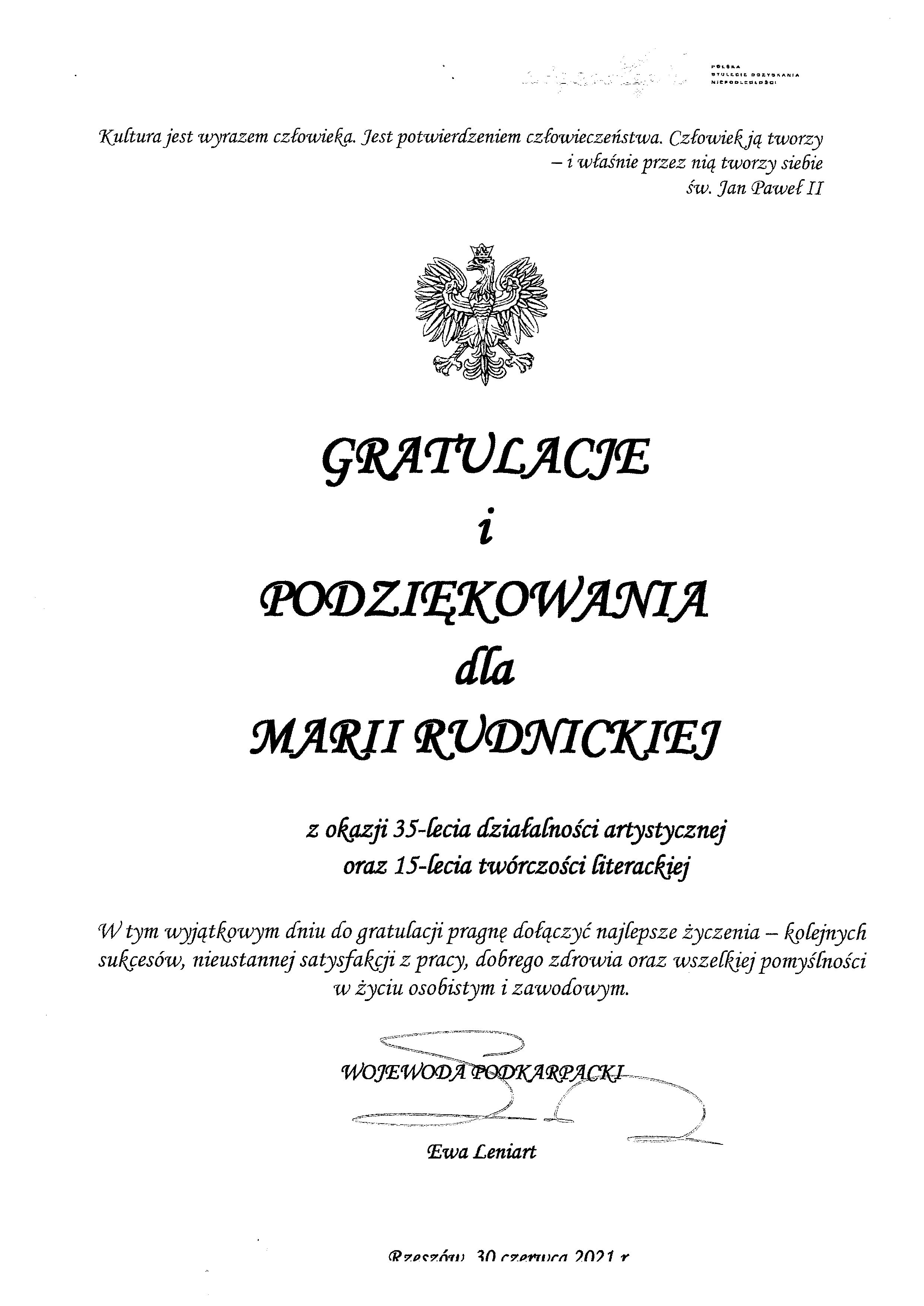 35-lecie działalności artystycznej, w tym 15-lecie twórczości literackiej obchodzi kol. Maria Rudnicka - okolicznościowe uroczystości odbyły się w WDK 30 czerwca 2021 r. - gratulujemy!