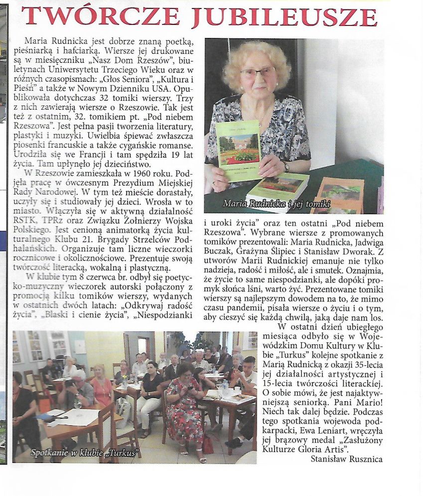 35-lecie działalności artystycznej, w tym 15-lecie twórczości literackiej obchodzi kol. Maria Rudnicka.