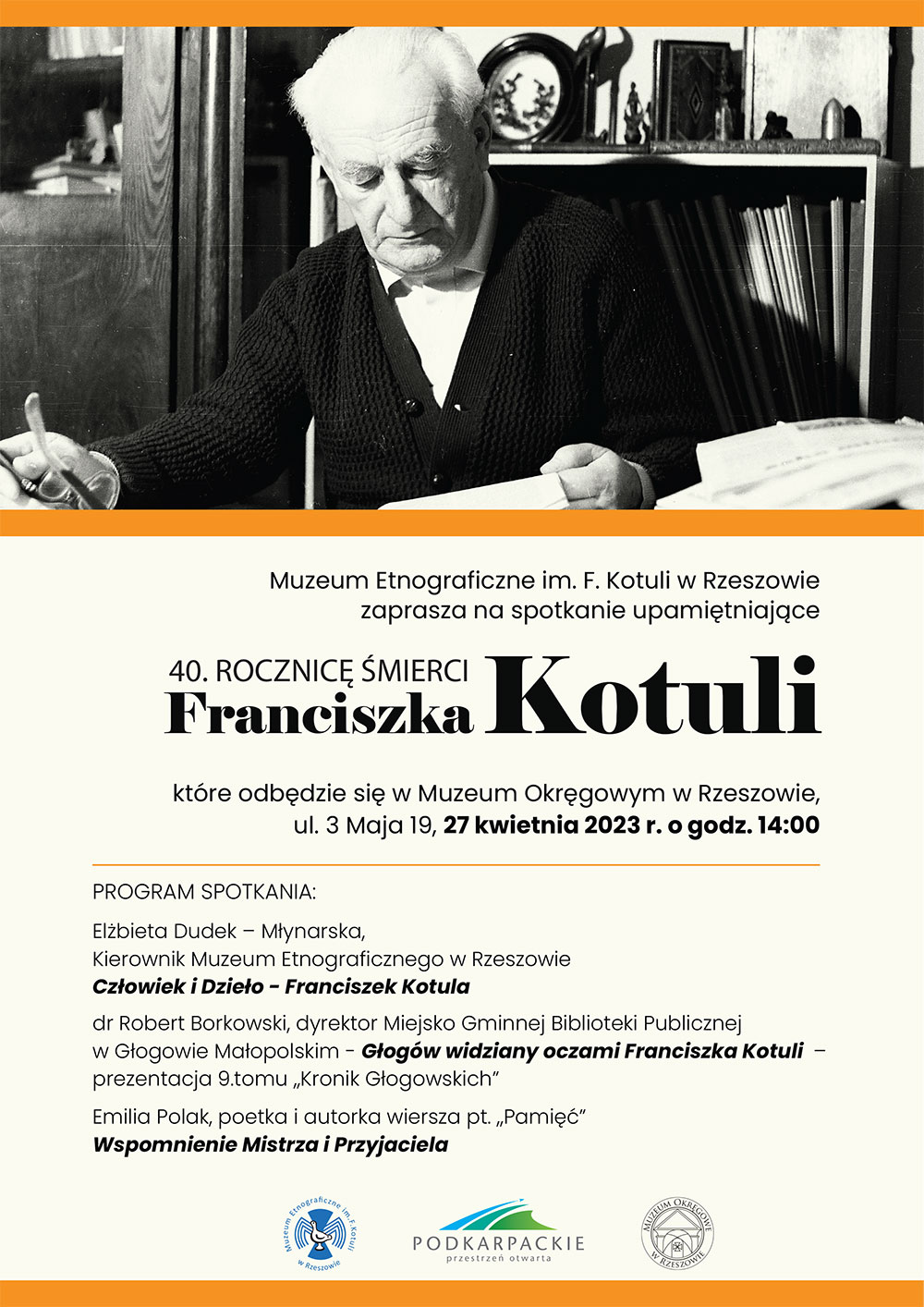 22 kwietnia przypada 40. rocznica śmierci Franciszka Kotuli, patrona Muzeum Etnograficznego w Rzeszowie. Z tej okazji serdecznie zapraszamy 27 kwietnia br. (czwartek) do Muzeum Okręgowym w Rzeszowie (ul. 3- go Maja 19), o godz. 14.00 na spotkanie upamiętniające tego uznanego muzealnika i badacza regionu.