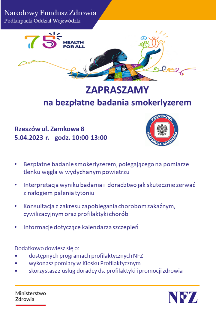 5 kwietnia 2023 (środa) w godz. od 10:00 do 13:00 w siedzibie NFZ w Rzeszowie przy ul. Zamkowej 8, każda osoba paląca i narażona na bierne palenie tytoniu będzie mogła skorzystać z bezpłatnego badania.