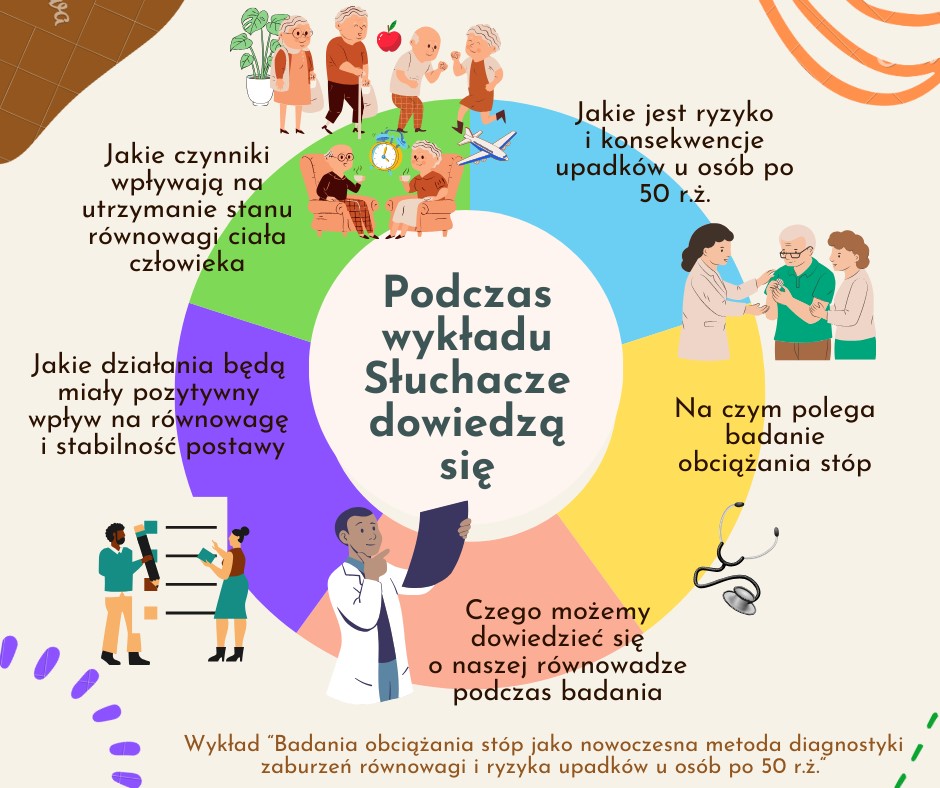 informujemy, iż Wyższa Szkoła Informatyki i Zarządzania kontynuuje realizację projektu „Akademia Zdrowia 50+”, który obejmuje cykl bezpłatnych wykładów i warsztatów dla osób w wieku powyżej 50 roku życia. Wraz z rozpoczęciem nowego roku organizujemy nowe spotkania w ramach projektu. Startujemy już w styczniu - 17.01.2024 o godzinie 17.00 odbędzie się wykład pt. „Badania obciążania stóp jako nowoczesna metoda diagnostyki zaburzeń równowagi i ryzyka upadków u osób po 50 r.ż”. W załącznikach grafiki informujące o nadchodzącym wykładzie. Więcej informacji o najnowszym nadchodzącym wydarzeniu w tekście poniżej.