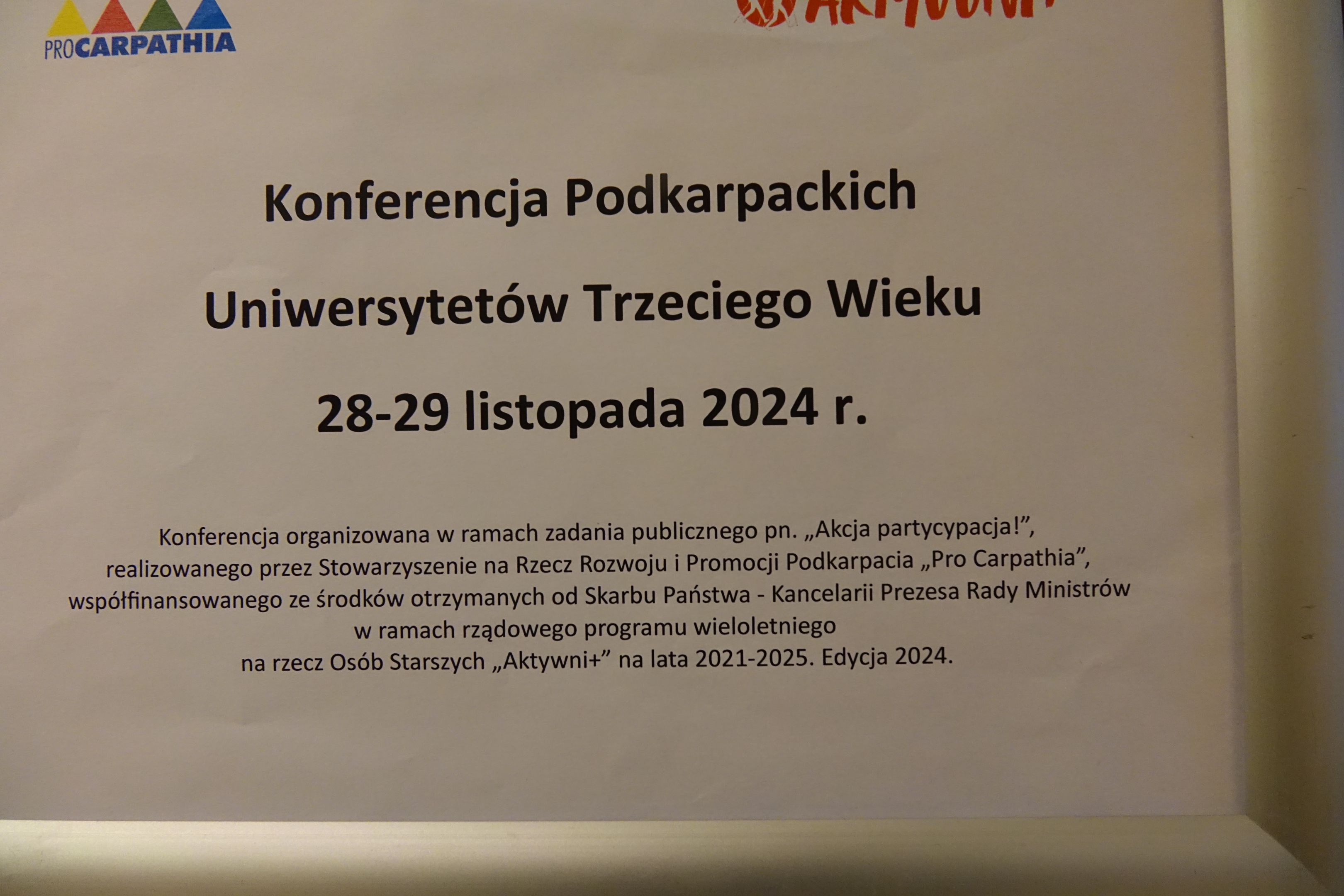 Zaproszenie na Konferencję wysłała do UTW-UR pani Dorota Zielińska, wiceprezes Stowarzyszenia PRO CARPATHIA w ramach projektu "Akcja partycypacja!", współfinansowanego z programu wieloletniego na rzecz Osób Starszych "Aktywni+" na lata 2021-2025. Edycja 2024. Konferencja odbywała się w bardzo eleganckich salach Hotelu Prezydenckiego. Udział w konferencji był bezpłatny i z każdego UTW można było zgłosić 4 osoby. Na zebraniu Zarządu UTW-UR dnia 20.11. uzgodniono, że formularze zgłoszeniowe złożą następujące osoby: Jan Ziąbek, Janusz Obarski na 28 i 29.11. oraz Danuta Kamieniecka–Przywara i Ewa Nowak na dzień 29.11. Natomiast kol. Paweł Urban też uczestniczył w konferencji 28 i 29.11, ale sam złożył swój akces. W dniu 28.11. głos zabierały osoby reprezentujące władze miasta i województwa oraz wygłosili wykłady: były Pełnomocnik Rektora UR ds. UTW-UR dr hab. prof.UR Andrzej Bonusiaki obecny opiekun dr Dominik Szczepański. W konferencji wzięły udział delegacje UTW z całego regionu, ok. 100 osób. W drugim dniu miała wystąpienie pani Renata Butryn Pełnomocnik Wojewody ds. polityki senioralnej oraz przedstawicielka GUS w Rzeszowie. Następnie liderzy UTW przedstawiali prezentacje o działalności swoich organizacji. Danuta Kamieniecka–Przywara z UTW-UR przedstawiła w prezentacji historię powołania Porozumienia Podkarpackich UTW w 2014 r. oraz jego działalność w latach 2014–2019. Kol. Jan Ziąbek pomagał w obsłudze multimedialnej, a kol. Janusz Obarski i kol. Ewa Nowak robili dokumentację fotograficzną. Konferencja była znakomitym wydarzeniem, okazją do podzielenie się informacjami o działalności różnych UTW, istniejących problemach oraz możliwością integracji środowiska senioralnego regionu, które szczególnie ucierpiało w okresie pandemii Covid 19. W załączeniu agenda konferencji oraz zdjęcia.