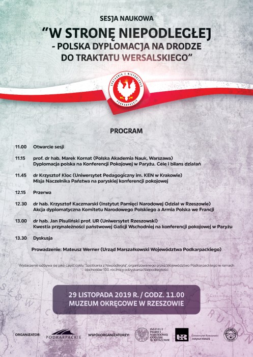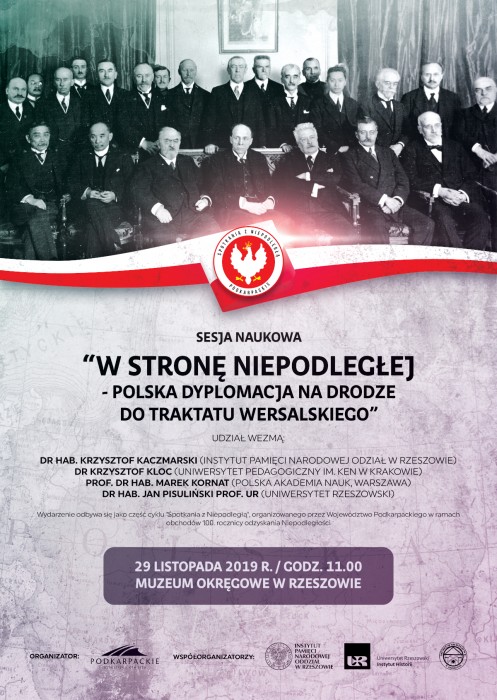 Sesja naukowa "W stronę Niepodległej - polska dyplomacja na drodze do traktatu wersalskiego", odbędzie się 29 listopada 2019 r./piątek/ od godziny 11.00 w Muzeum Okręgowym w Rzeszowie (ul. 3 Maja 19) - zainteresowanych dziejami ojczystymi