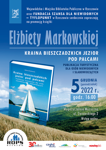 Fundacja Szansa dla Niewidomych – Tyflopunkt w Rzeszowie we współpracy z Wojewódzką i Miejską Biblioteką Publiczną w Rzeszowie zaprasza na spotkanie informacyjne połączone z promocją najnowszej publikacji Fundacji Szansa dla Niewidomych pn. „Kraina bieszczadzkich jezior pod palcami. Publikacja turystyczna dla osób niewidomych i słabowidzących”. Spotkanie odbędzie się w dniu 5 grudnia 2022 roku, w godz. 16:00-18:00 w Wojewódzkiej i Miejskiej Bibliotece Publicznej w Rzeszowie, Wypożyczalnia Muzyczna, ul. Żeromskiego 2, Rzeszów.