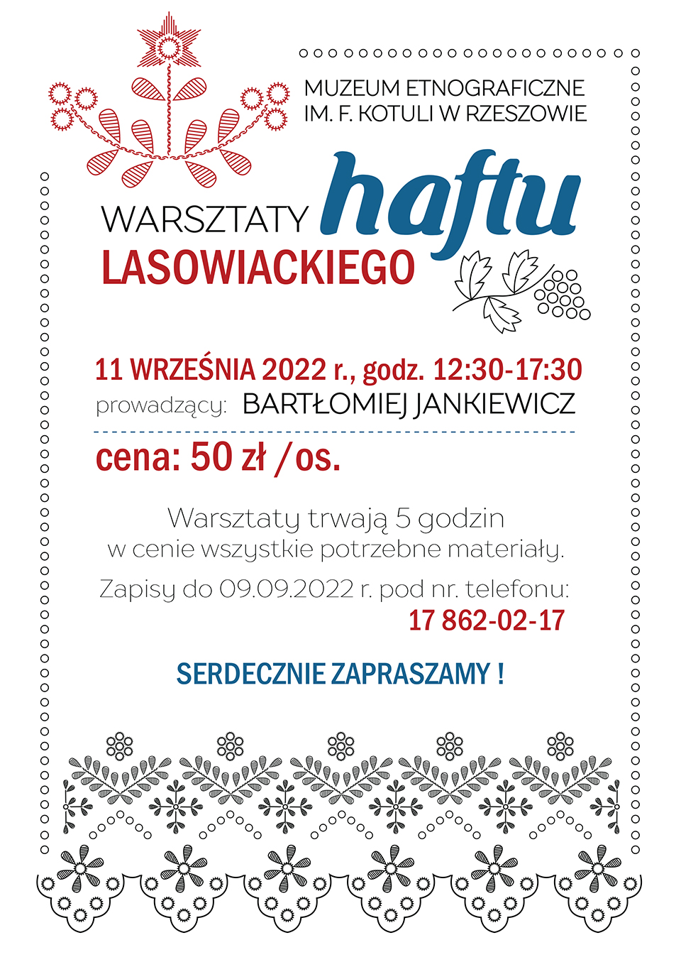 Zapraszamy na kolejne warsztaty. Tym razem poznamy haft lasowiacki – z okolic Kolbuszowej.