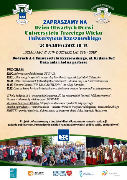 Zapraszamy na "DZIEŃ OTWARTYCH DRZWI" UNIWERSYTETU TRZECIEGO WIEKU UNIWERSYTETU RZESZOWSKIEGO: 24 września 2019 r. do budynku A-1 UR ul. Rejtana 16C, aula główna i hol na parterze, w godz. 10.00 - 15.