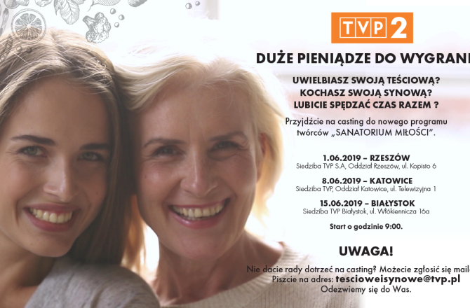 TVP 2 zaprasza na sobotni casting do nowego programu "Teściowe i Synowe" - pary kobiet rywalizowały będą ze sobą i innymi. Zależy nam by pozyskać ciekawe, aktywne osoby starsze i młodsze chcące powalc