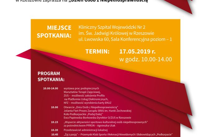 Dzień Osób z Niepełnosprawnością - 17 maja 2019 r. w godz. 10.00-14.00, sala konferencyjna poziom -1 w Klinicznym Szpitalu Wojewódzkim Nr 2 ul.Lwowska 60.