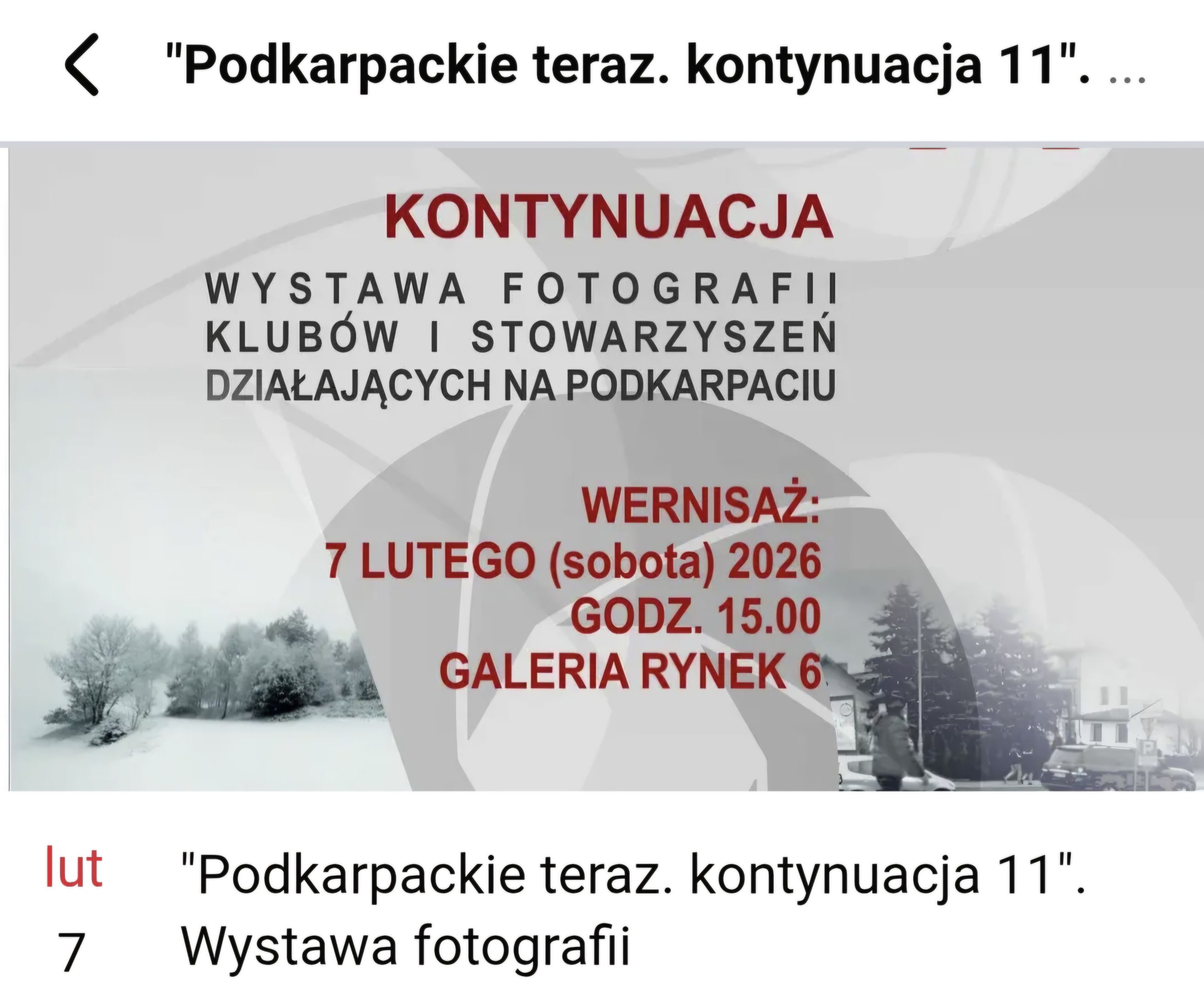 W Wystawie Fotografii Klubów i Stowarzyszeń Działających na Podkarpaciu: "Podkarpackie Teraz. Kontynuacja 11" w Galerii Rynek 6 w Jarosławiu, 7-27.02.2026, uczestniczyli członkowie Klubu Foto UTW-UR: