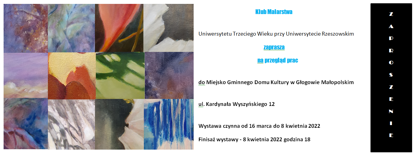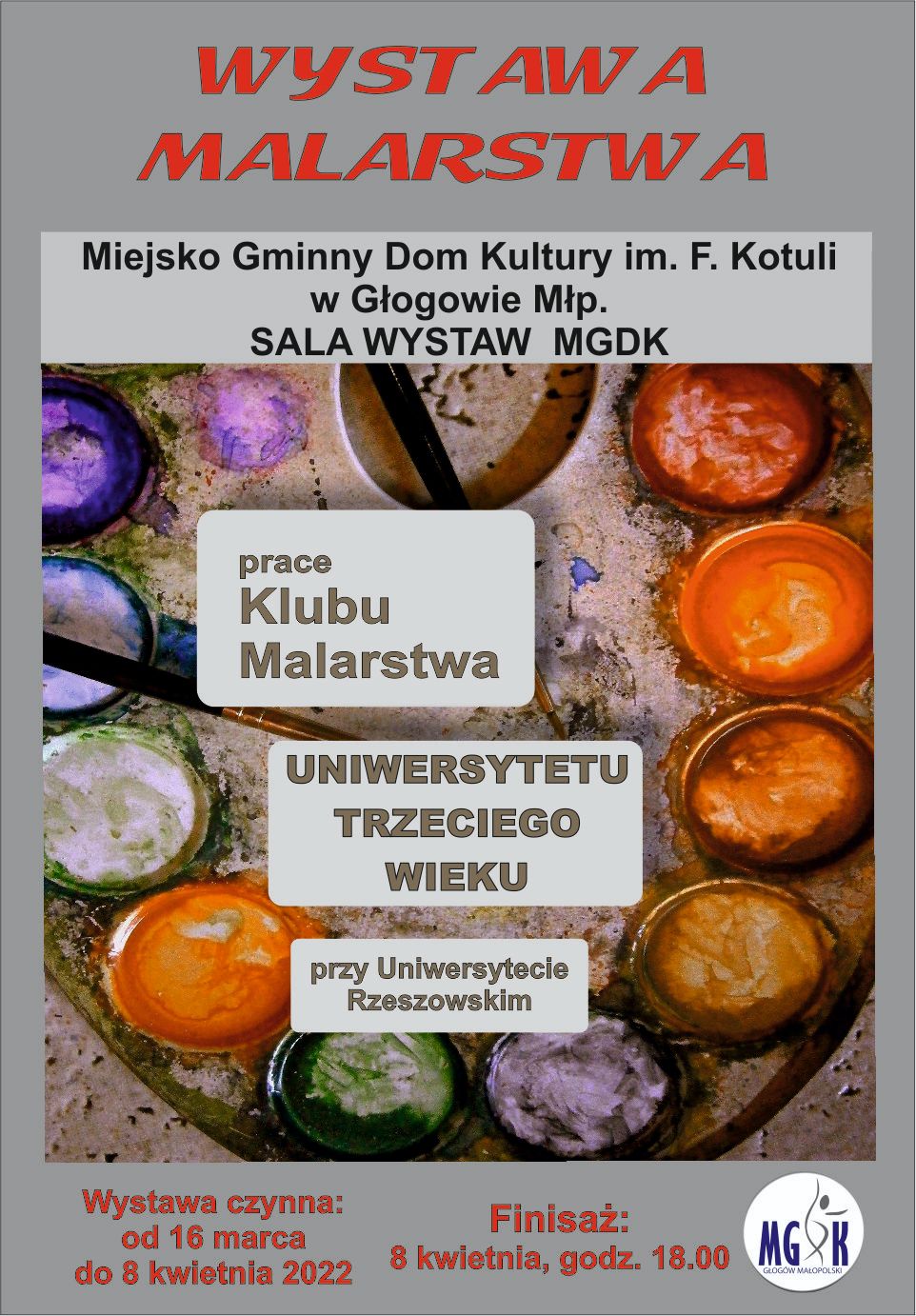 Klub malarstwa UTW-UR zaprasza na wystawę swoich prac w Miejsko-Gminnym Ośrodku Kultury w Głogowie Małopolskim i finisaż, który odbędzie się w piątek 8 kwietnia o godz. 18.00.