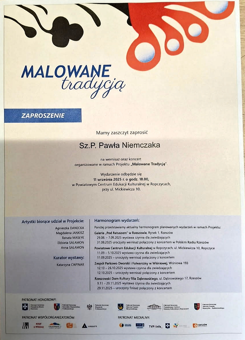 W czwartek 11 września 2025 o godzinie 18.00. w Powiatowym Centrum Edukacji Kulturalnej w Ropczycach przy ul. Mickiewicza 10 miały miejsce wernisaż oraz koncert zorganizowane w ramach Projektu „Malowane Tradycją”.