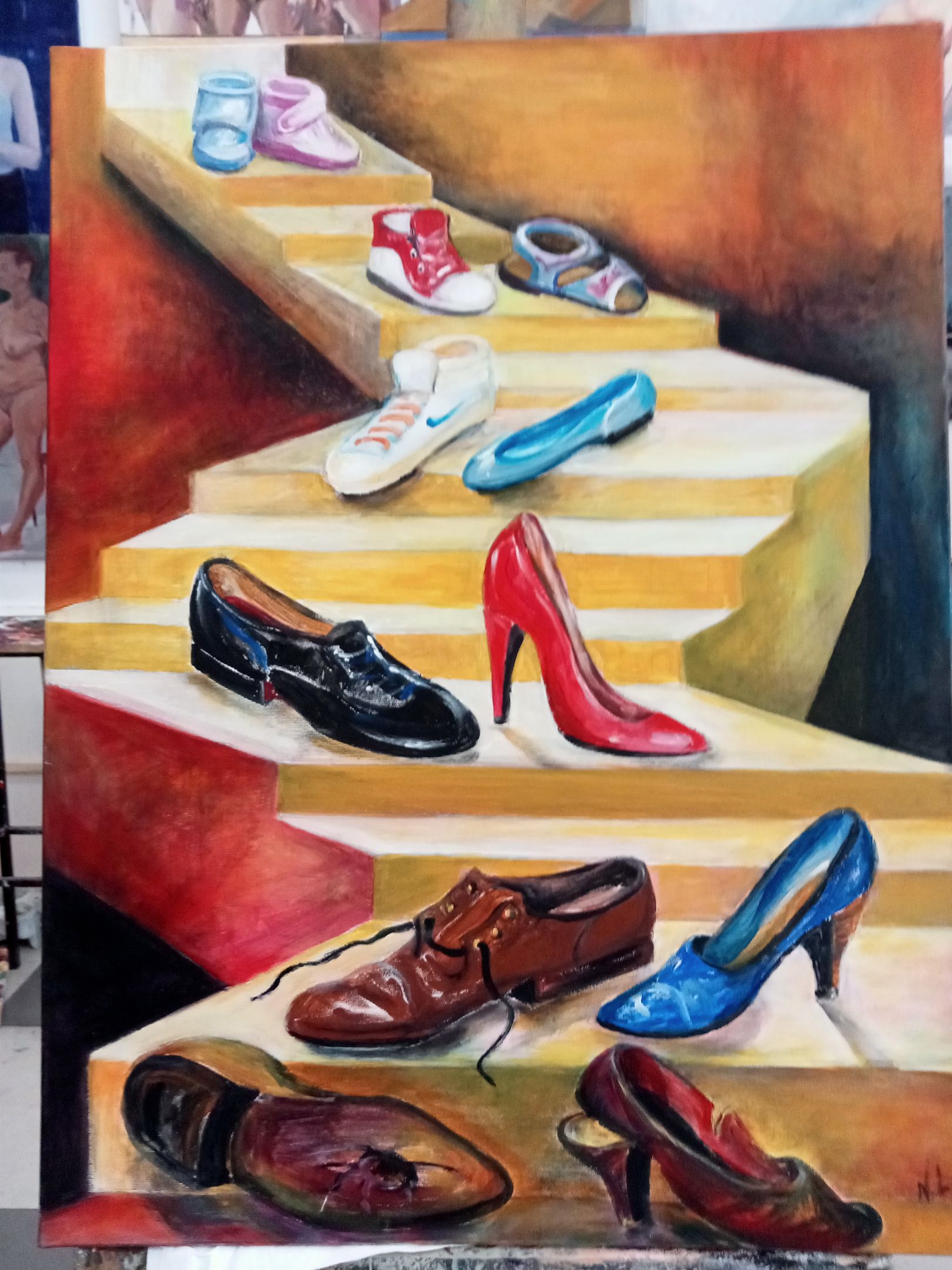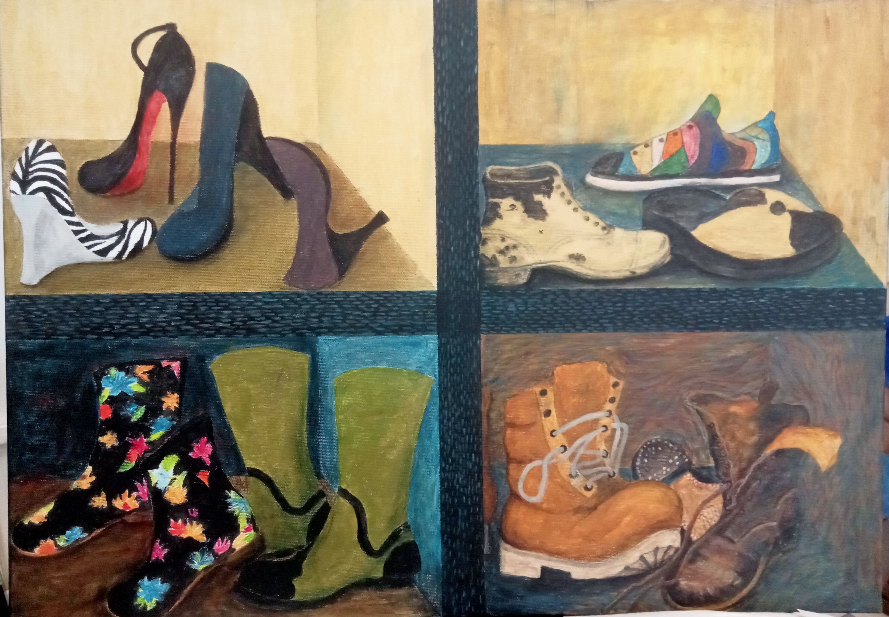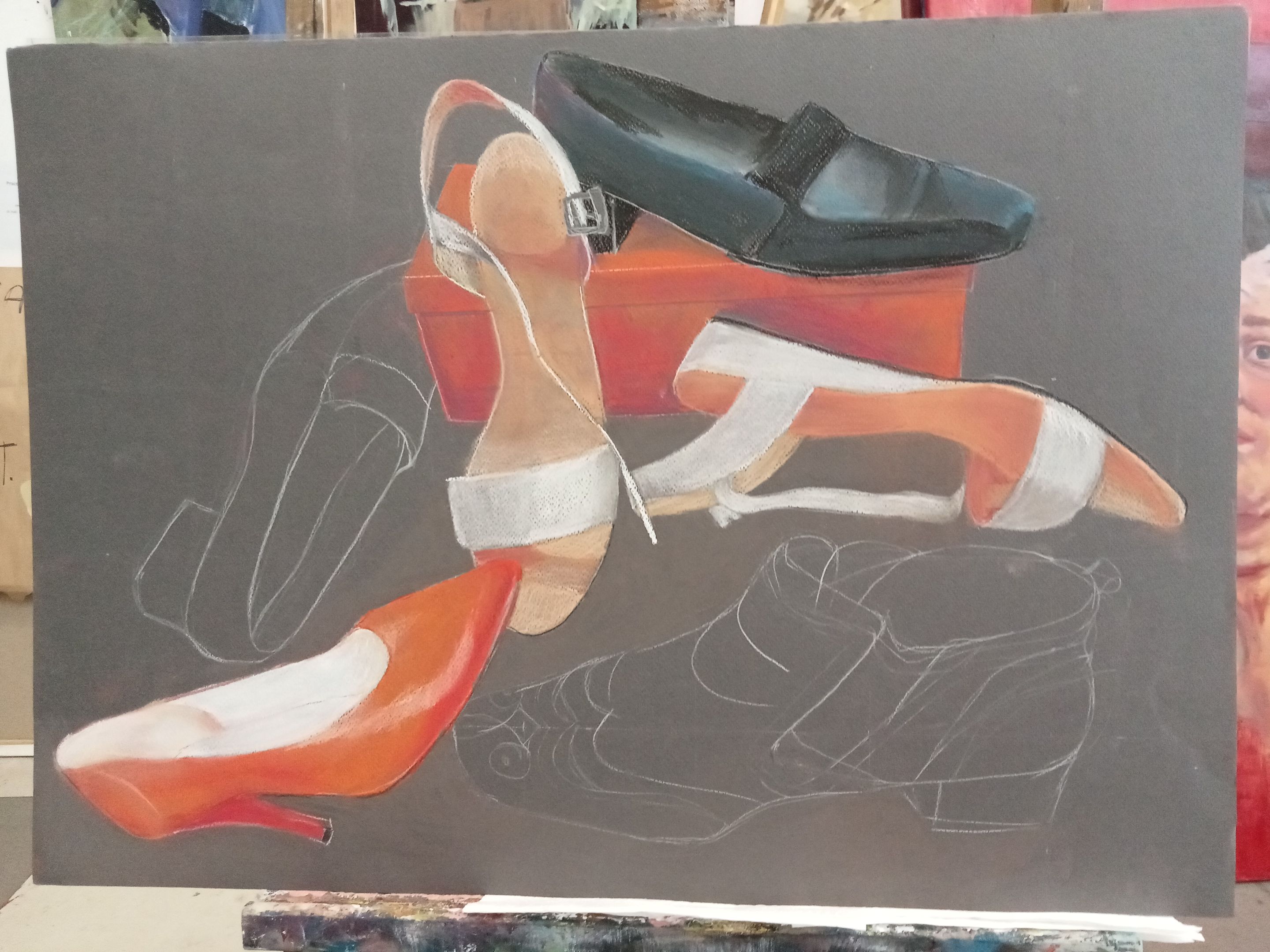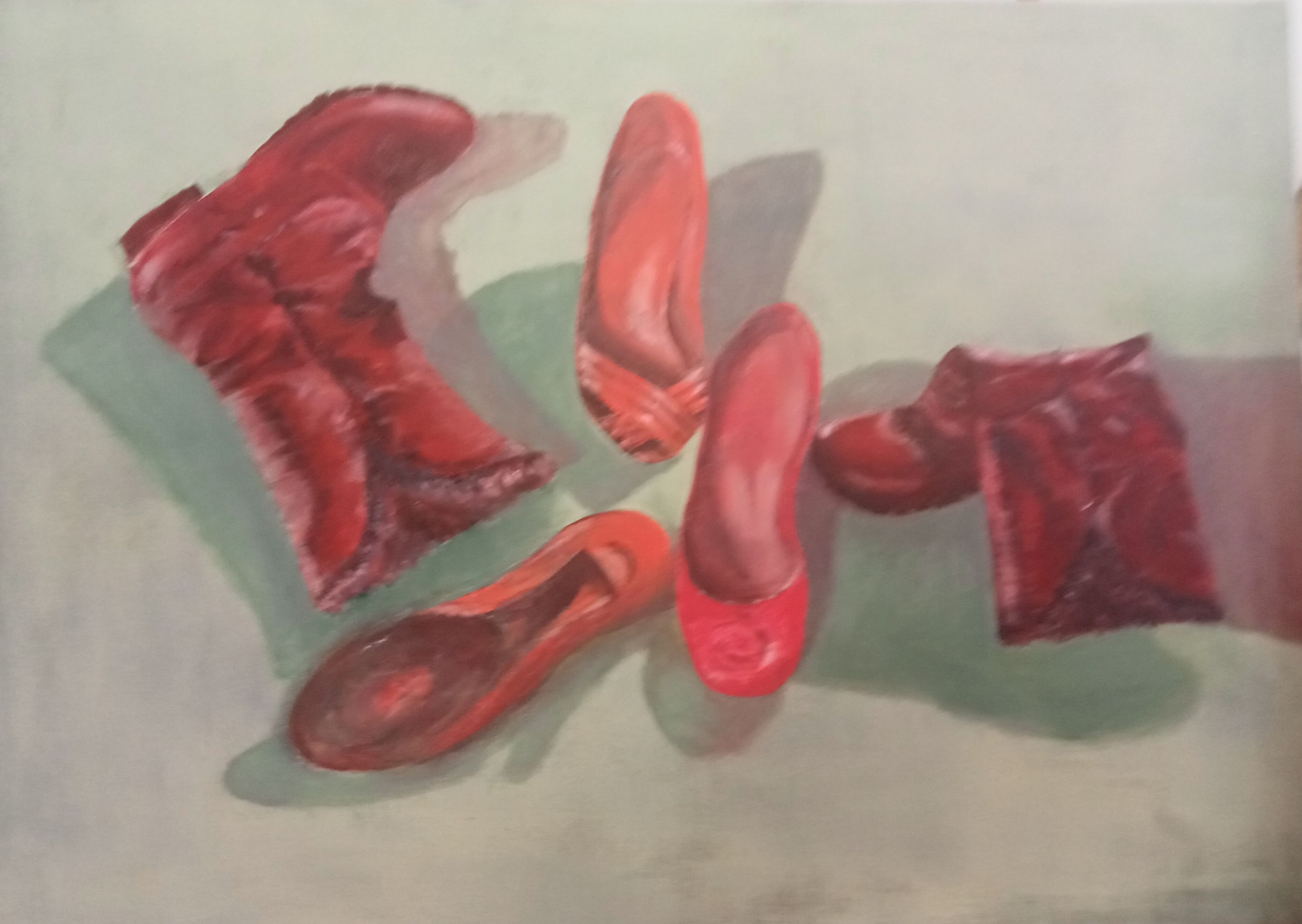 17.05.24. - kolejny temat zajęć: BUTY - obraz powinien przedstawiać kompozycję butów wszelkiego rodzaju (damskie, męskie, dziecięce), nie do pary i o różnym stopniu zużycia; powinien zawierać myśl przewodnią autora, przesłanie lub wspomnienie.