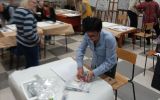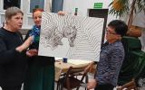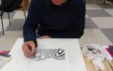 Obraz pierwszy: ”Animalis”- wykonaliśmy na formatach 70x50cm, motyw zwierzęcia przedstawiony w ścisłej wizualnej konwencji Op-Art (optical-art), popularnego kierunku sztuki lat 50.i 60. XX wieku. Obrazy należało namalować tak, aby wytworzyć różne iluzje i wzrokowe złudzenia, a przez to spowodować „ukrycie” głównego tematu jako pewnej zagadki. Sposób malowania tego zadania był dla wielu z nas dużym wyzwaniem i przede wszystkim nowym, intrygującym doświadczeniem artystycznym. Ciekawość końcowego rezultatu obrazu aktywizowała nas do pracy twórczej. Najpierw do wytężonego myślenia, jak zaprojektować logiczne układy tworzące efekty rozwibrowania i zdynamizowania płaszczyzn kompozycji malarskiej, a potem do cierpliwego, estetycznego i precyzyjnego malowania. Było to dla nas bardzo pracochłonne ćwiczenie. Ale malowaliśmy nasze kompozycje precyzyjnie, aby osiągnąć cel określony w zadaniu. Poznaliśmy, w jaki sposób można tworzyć sztukę wizualną przy zastosowaniu tylko zestawień kontrastu bieli i czerni, aby uzyskać efekt optycznych iluzji. Każdy z nas wykazał się ogromną pomysłowością, kreatywnością w fazie szkicowania swoich pomysłów. Powstały niezwykłe malarsko-graficzne obrazy jakich nigdy jeszcze nie malowaliśmy.