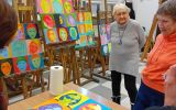 Obraz drugi ”Autoportret w stylistyce Pop Art, inspiracja dziełem Andy Warhola”. Ten temat namalowaliśmy w kwadracie 60x60cm. Zgodnie z podanym nam zadaniem, inspiracją do tego obrazu były dzieła A. Warhola - głównego przedstawiciela Pop art’ u (Popular art), nurtu w sztuce lat 50.XX wieku. W konwencji dzieł portretowych tegoż światowej sławy artysty, każdy z nas zastosował w swoim obrazie własny wizerunek portretowy, ale odpowiednio opracowany na zajęciach podczas etapu projektowania. Niezmiernie interesującym doświadczeniem dla każdego z nas, było namalowanie autoportretów w niekonwencjonalny sposób. Praca nad tym obrazem dostarczyła nam wiele radości. Ale była również wyzwaniem w wymyślaniu i kreowaniu różnych wariantów malarskiego przedstawienia własnego, zwielokrotnionego portretu. Ten temat był dla nas nowym, ciekawym doświadczeniem w rozwijaniu umiejętności malowania obrazu. Sposób wykonania tego zadania poszerzył nasze tradycyjne myślenie o tematyce portretowej, zaś praktyczna twórcza praca w grupie wyzwoliła odwagę w decyzjach rozstrzygnięć kolorystycznych malowanych obrazów.