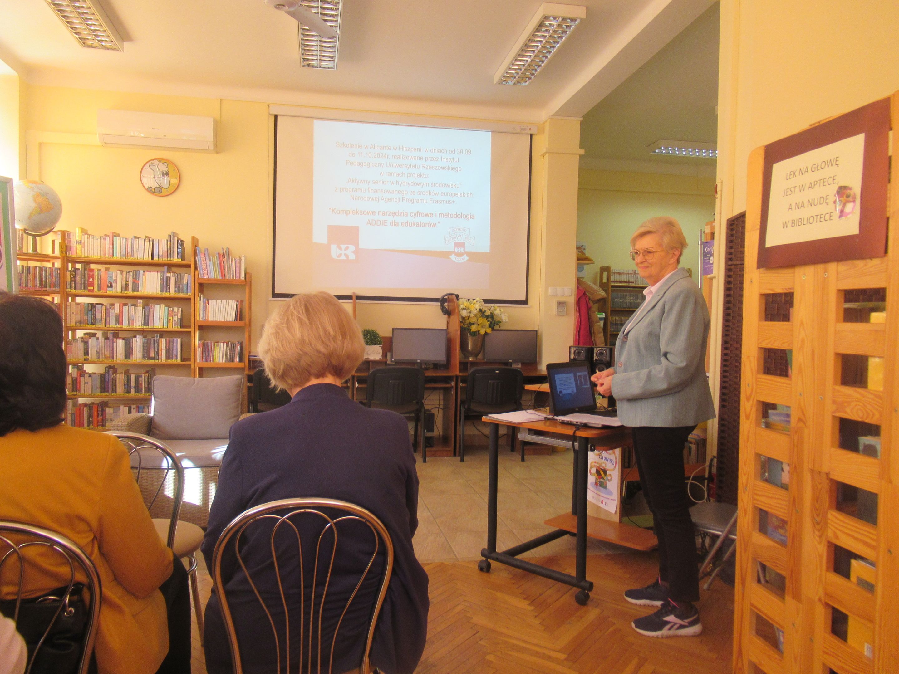 Prezentację PPT oraz krótkie filmiki z pobytu w Hiszpanii, przedstawiła Danuta Kamieniecka-Przywara, prezes UTW-UR: Szkolenie w Alicante w Hiszpanii w dniach od 30.09. do 11.10.2024 realizowane przez Instytut Pedagogiczny Uniwersytetu Rzeszowskiego w ramach projektu „Aktywny senior w hybrydowym środowisku” w programie finansowanym ze środków europejskich Narodowej Agencji Programu Erasmus+ - „Kompleksowe narzędzia cyfrowe i metodologia ADDIE dla edukatorów.” Swoje wystąpienie prelegentka zaczęła od historii realizacji projektu Erasmus +, który był pierwszym tego rodzaju doświadczeniem dla UTW-UR. Następnie przypomniała krótko informacje o samym Alicante – mieście na wschodnim wybrzeżu Hiszpanii w regionie Walencja. Prezentacja obejmowała blisko 150 slajdów, zawierających zdjęcia z przebiegu szkolenia, jak też migawki krajobrazu, architektury i uroczystości lokalnych. Początkowe slajdy to oczywiście lotnisko, potem hotel i pierwsze wrażenia z powitania edukatorów i zapoznanie z programem szkolenia. Jego zasadnicze elementy to wykłady, ćwiczenia i warsztaty, pogrupowane w dwa bloki: Blok 1: Tworzenie treści cyfrowych do nauczania zarówno z wykorzystaniem, jak i bez wykorzystania sztucznej inteligencji. Blok 2: Metoda ADDIE i jej wdrażanie w nauczaniu stacjonarnym i e-learningu. Całe szkolenia odbywało się w języku angielskim. Po zakończeniu zajęć uczestnicy mogli podziwiać i fotografować Alicante, jego bogatą roślinność, architekturę, uliczki starego miasta i pomniki oraz rzeźby. Jako obiekt warsztatów fotograficznych gospodarze zaproponowali halę targową. Z prezentowanych slajdów widać, że były to wrażenia niezapomniane: owoce morza, różnego rodzaju mięsa i wędliny, warzywa, owoce i egzotyczne kwiaty prezentowane w oryginalny sposób, wabiące kupujących i turystów. W przerwach między zajęciami, popołudniami i w weekendy gospodarze dołożyli wszelkich starań, aby gościom z Polski pokazać jak najwięcej i przybliżyć historię regionu, począwszy od Greków i Fenicjan, poprzez Rzymian, Gotów i Maurów. Ślady tej historii to Castillo de Santa Barbara i stare miasto Barrio de Cruz, świątynie, muzea oraz Plaza de Torros. Kursanci odwiedzili także kurort Calpe, miasteczko Altea, miasto Santa Pola skąd płynęli na wyspie Tabarca. Po weekendzie - warsztaty, w tym prezentacja Rzeszowa w odwiedzanych placówkach edukacyjnych; projektowanie edukacyjne w systemie ADDIE.