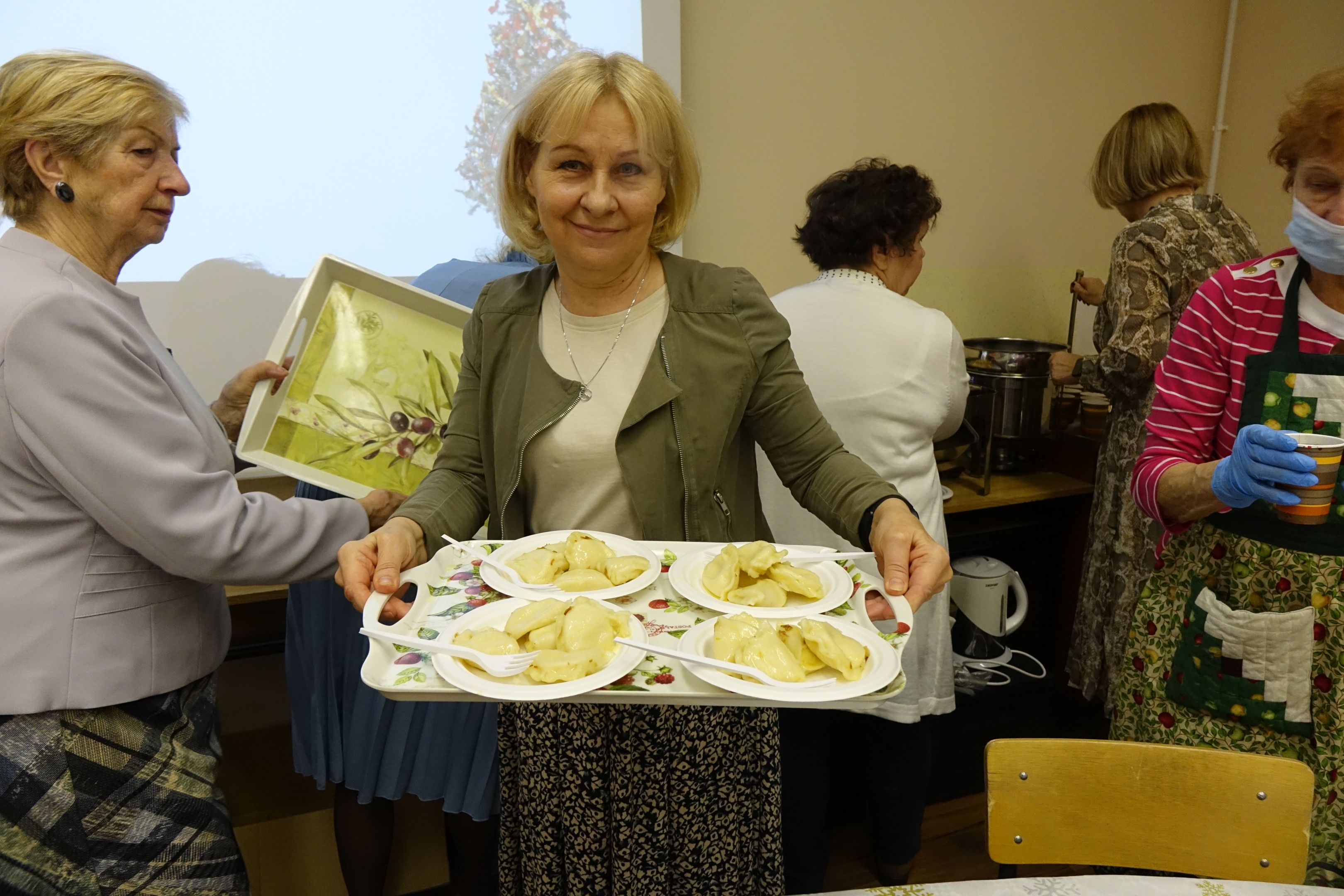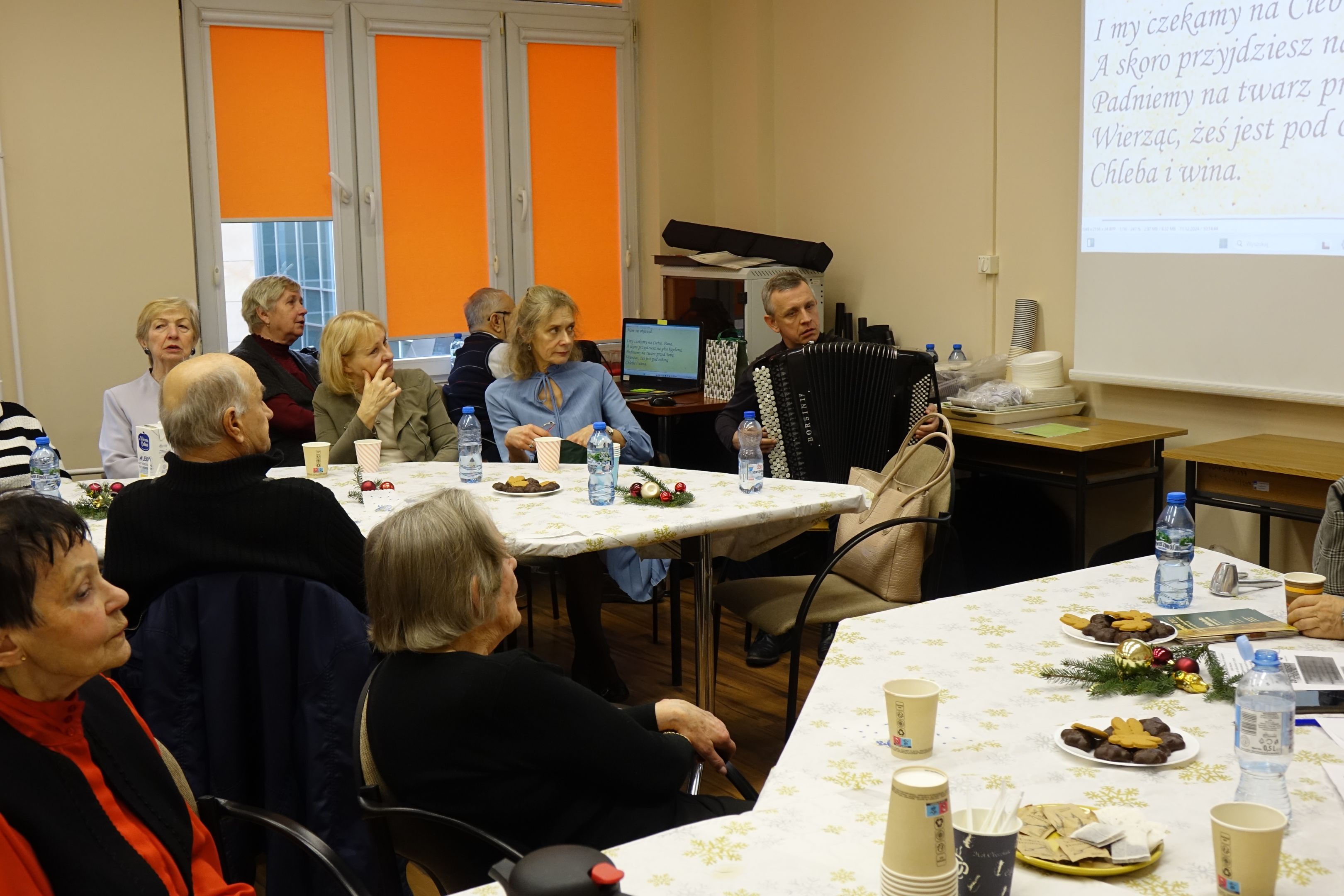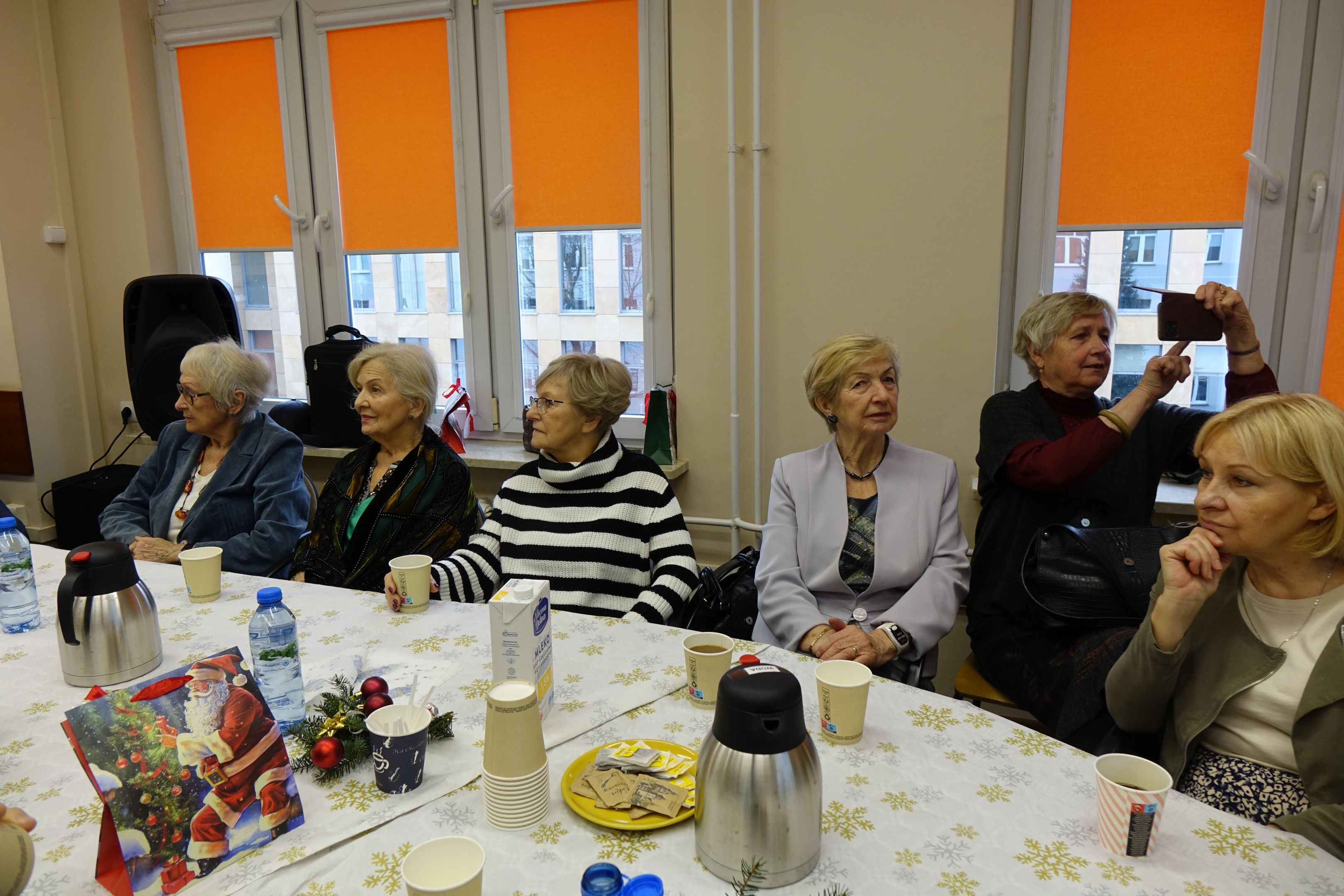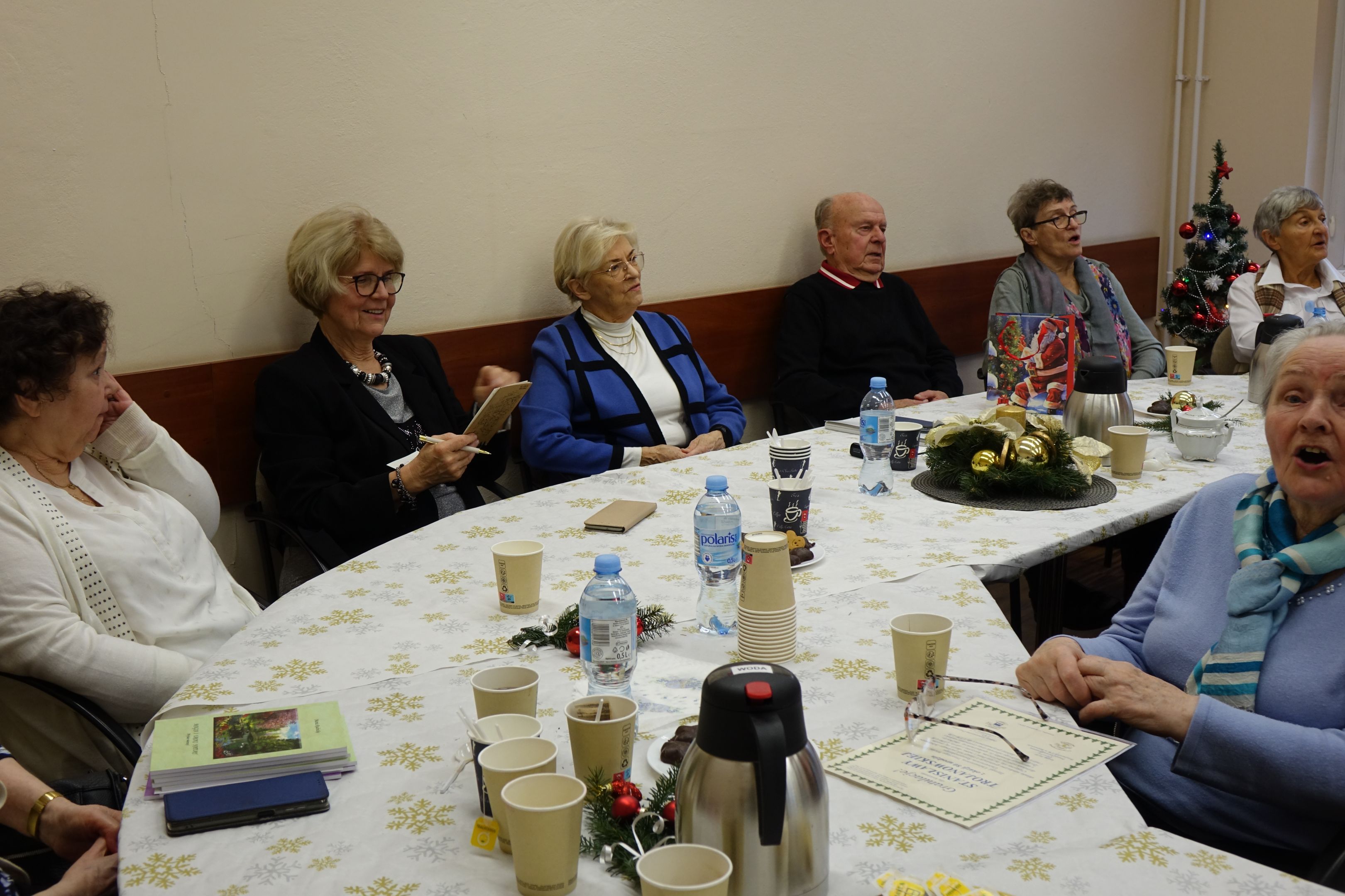 Wszyscy uczestnicy spotkania otrzymali symboliczne prezenty, zaś osoby, które w 2024 roku kończyły 80 lat, jeszcze dodatkowo dyplomy gratulacyjne i niewielkie upominki urodzinowe. Przy pięknie nakrytych stołach seniorzy mogli skosztować czerwonego barszczu, pysznych pierogów i tradycyjnych pierniczków. Zaraz potem rozpoczęło się kolędowanie przy wtórze akordeonu. Instrumentalne uświetnienie spotkania zapewnił prof. dr hab. Paweł Paluch. W przerwach między kolędami tradycyjnie już obecne na spotkaniu seniorki – poetki czytały swoje utwory: kol. Maria Rudnicka i kol. Teresa Tylkowska, natomiast kol. Halina Cisak z klubu Malarstwa podkreślała, jak ważne jest w życiu seniora znalezienie własnej pasji, która pozwala twórczo pracować i przynosić satysfakcję.