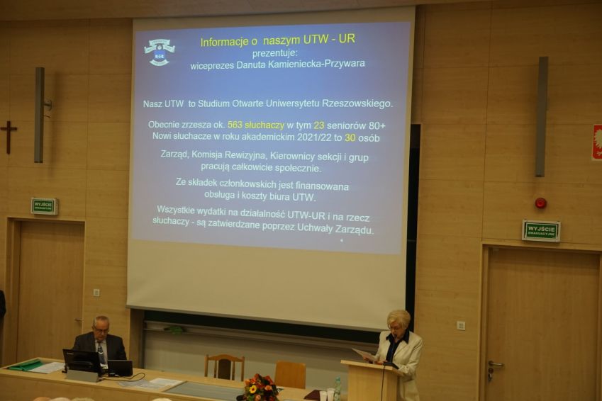 Uroczysta inauguracja roku akademickiego 2021/2022 dla słuchaczy Uniwersytetu Trzeciego Wieku Uniwersytetu Rzeszowskiego odbyła się 19 października br. w auli 126 budynku A-0 Uniwersytetu Rzeszowskiego. Zebranych powitała Danuta Kamieniecka–Przywara - wiceprezes UTW-UR ds. naukowych. Jako pierwszy zabrał głos pan Stanisław Kruczek, członek Zarządu Województwa Podkarpackiego, który w imieniu Marszałka Województwa życzył słuchaczom satysfakcji i sukcesów w kontynuowaniu pogłębiania wiedzy i realizacji swoich pasji. List gratulacyjny od Wojewody Podkarpackiej pani Ewy Leniart, odczytał przedstawiciel pan Krystian Pasternak. Następnie prowadząca odczytała list Prezydenta Miasta Rzeszowa pan Konrada Fijołka oraz od dr hab. prof.UR Wojciecha Walata. Przewodnicząca Rzeszowskiej Rady Seniorów pani Barbara Stafiej zachęcała seniorów do aktywnego udziału w projekcie realizowanym przez RRS i Stowarzyszenie Kreatywny Senior. Po tych oficjalnych wystąpieniach, chór UTW-UR CANTILENA odśpiewał Gaudeamus Igitur.