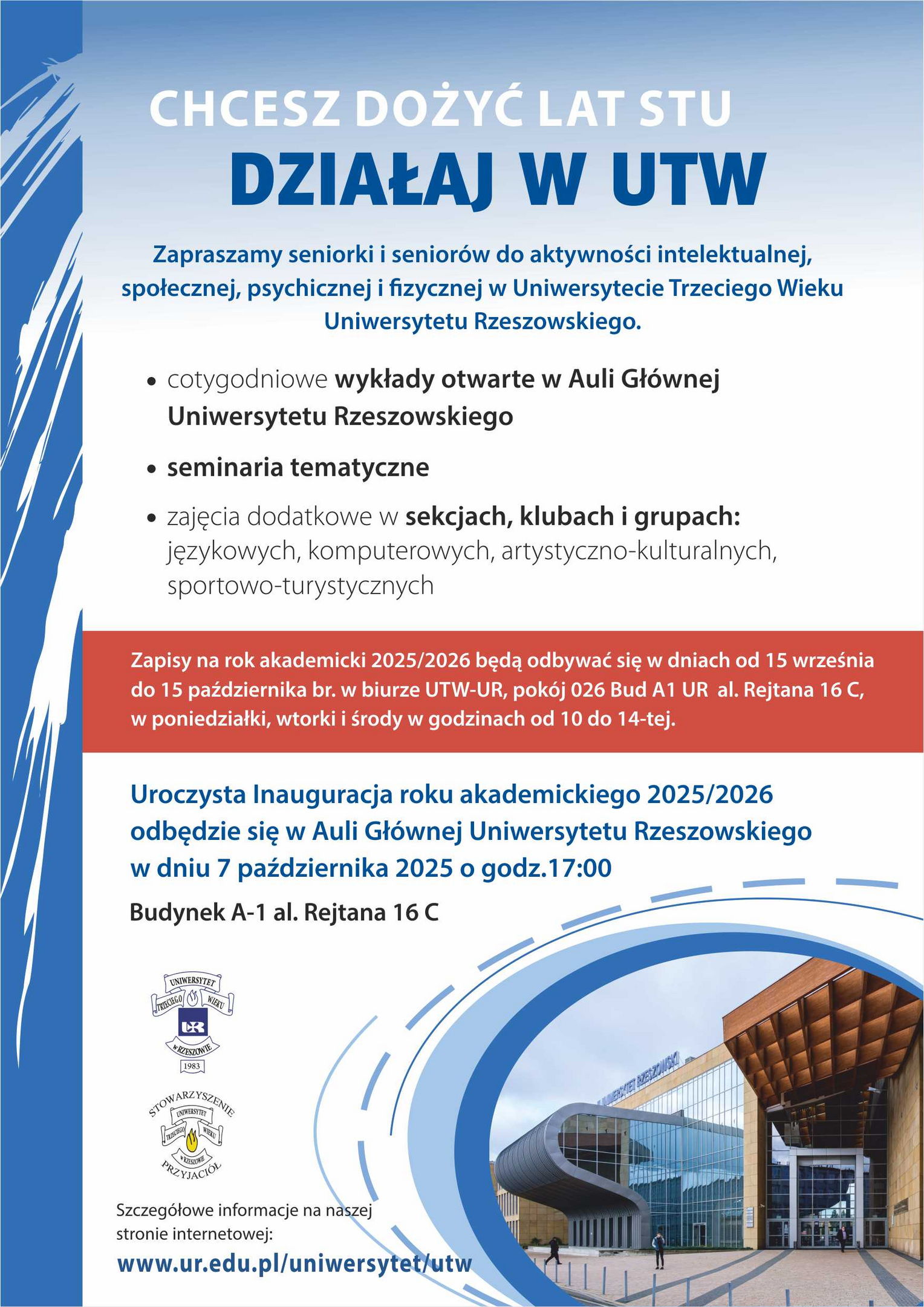 Zapisy przyjmowane są w Biurze UTW-UR ul. Rejtana 16 C p.026 w godzinach pracy:
