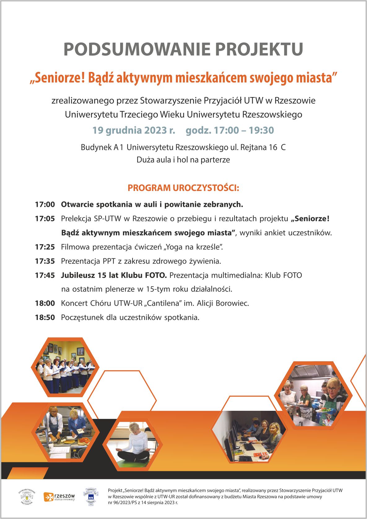 Projekt „Seniorze! Bądź aktywnym mieszkańcem swojego miasta”, realizowany przez Stowarzyszenie Przyjaciół UTW w Rzeszowie wspólnie z Uniwersytetem Trzeciego Wieku Uniwersytetu Rzeszowskiego, został dofinansowany z budżetu Miasta Rzeszowa na podstawie umowy nr 96/2023/PS z 14 sierpnia 2023 r.