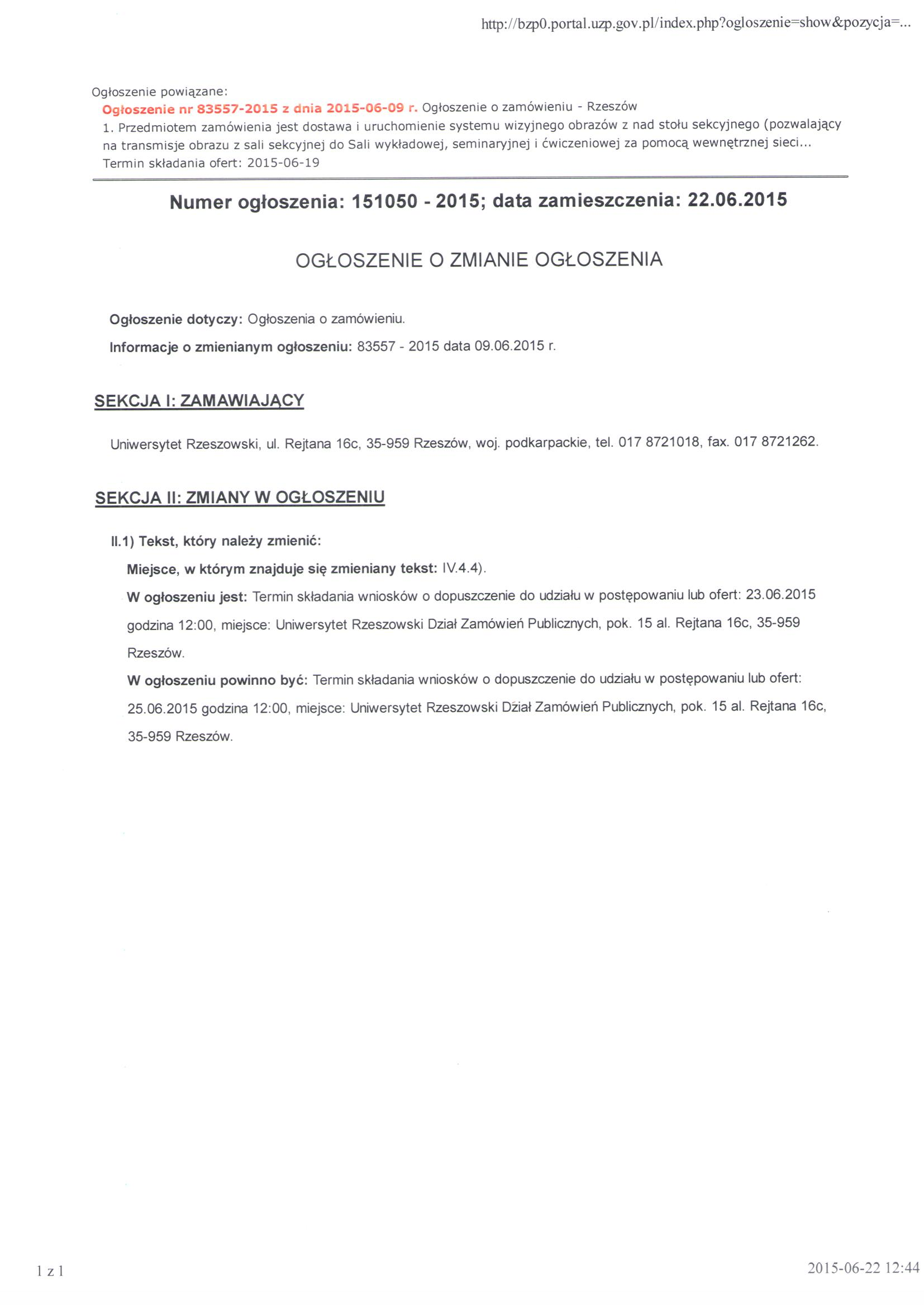 Ogłoszenie o zmianie ogłoszenia z dnia 22.06.2015 r.
