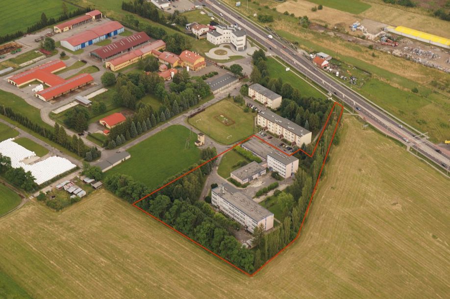 zabudowanej nieruchomości gruntowej , położonej w Krasnem k/ Rzeszowa, Gmina Krasne przy drodze krajowej nr 4. W zasób przedmiotowej nieruchomości wchodzą: trzy działki gruntowe o nr ew. 2091/4, 2091/7 i 2091/8 o łącznej powierzchni 1,2800 ha, dla których Sąd Rejonowy w Rzeszowie prowadzi księgę wieczystą o nr RZ1Z/102417 zabudowane budynkami murowanymi : trzysegmentowym budynkiem o zróżnicowanej ilości kondygnacji ( jednym segmentem czteropiętrowym, dwoma segmentami parterowymi) o pow. użytkowej 1479,50 m² , trzykondygnacyjnym, podpiwniczonym budynkiem o pow. użytkowej 2414,00 m². Cała nieruchomość ogrodzona z budowlami gospodarczymi ( stalowa wiata magazynowa, murowany budynek gospodarczy).