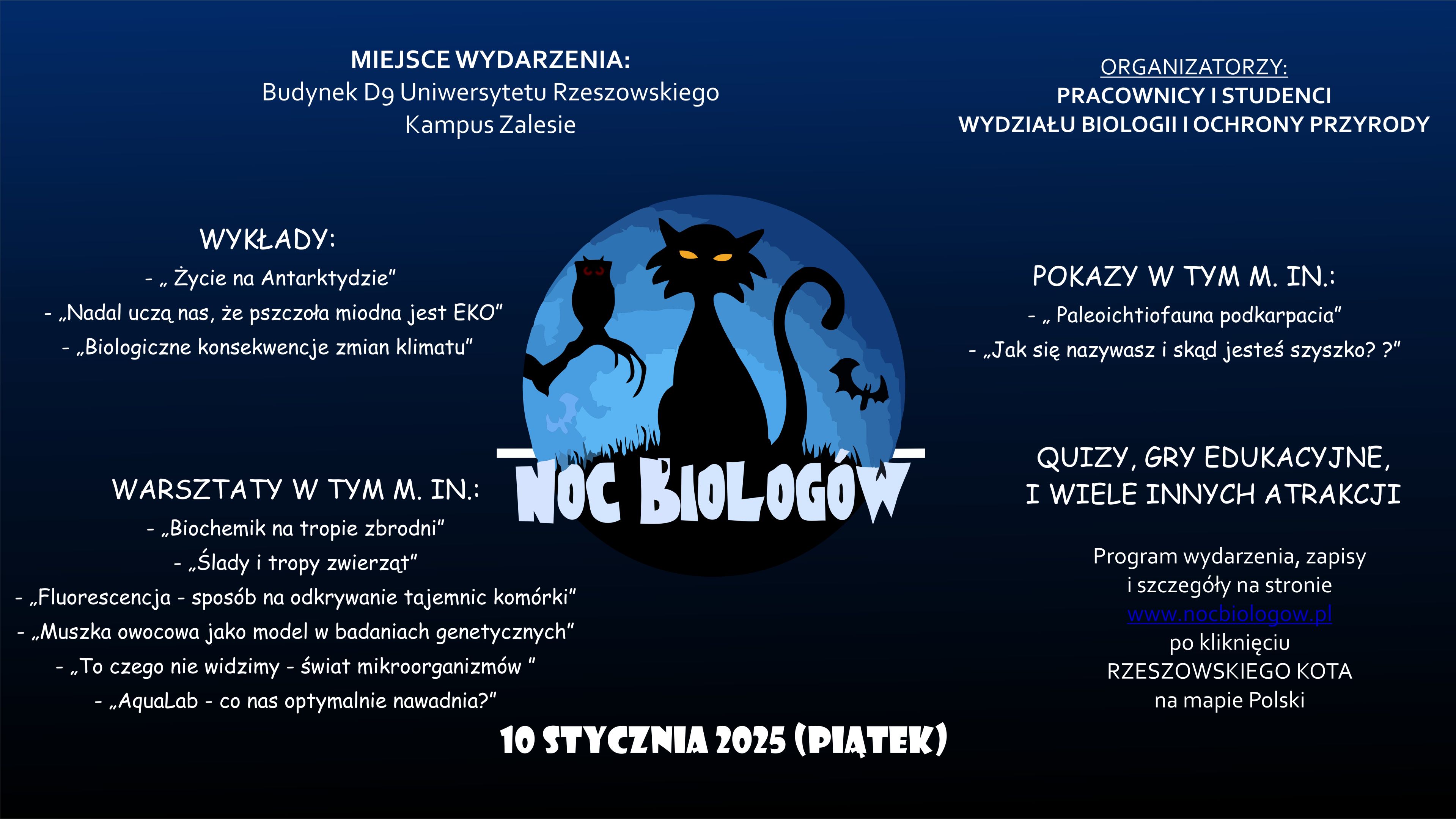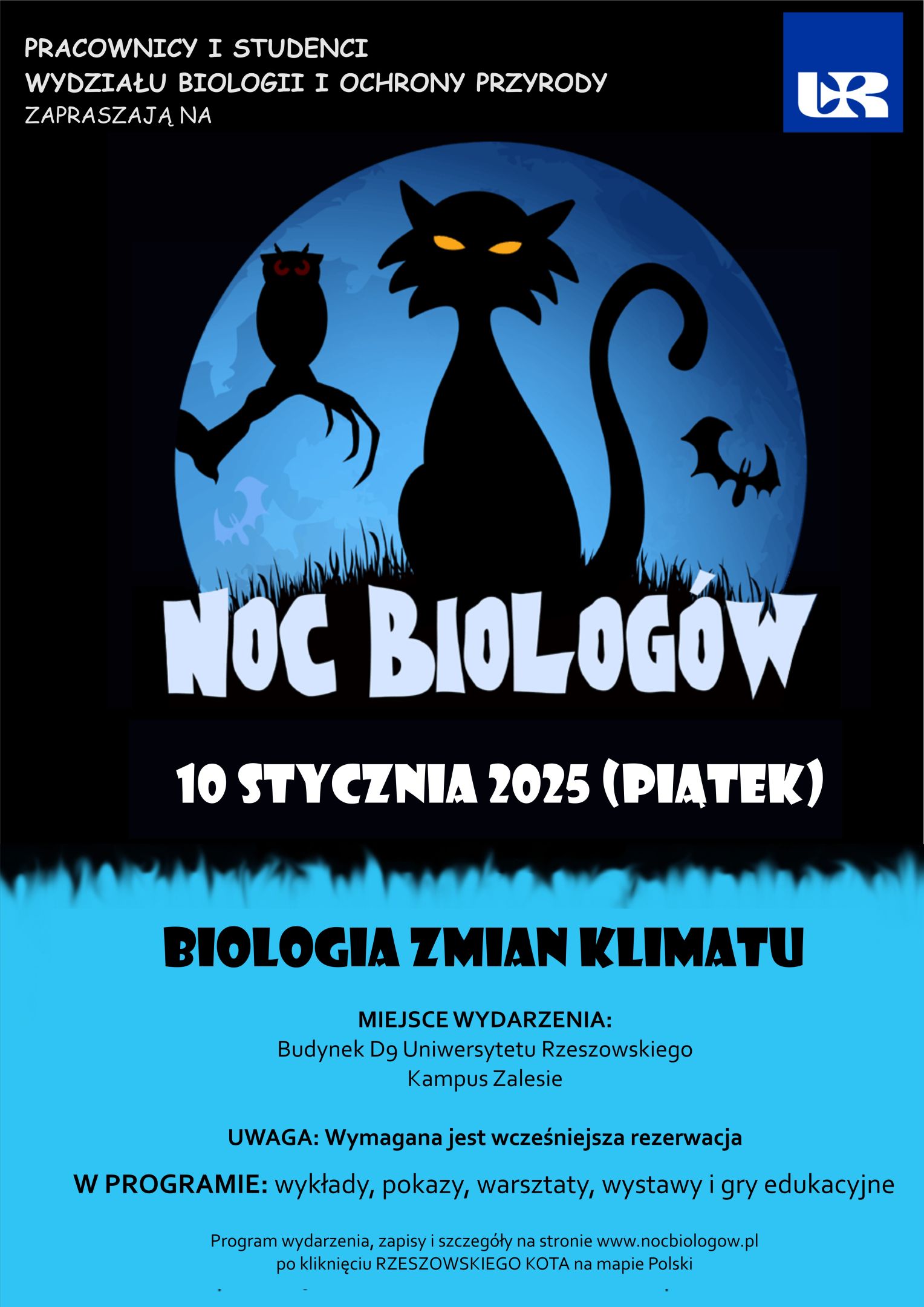 10 stycznia 2025 r. (piątek) w godz. 14:00- 20:00 odbędzie się dziewiąta edycja Nocy Biologów w Rzeszowie. Pracownicy i studenci Wydziału Biologii i Ochrony Przyrody Uniwersytetu Rzeszowskiego zapraszają do uczestnictwa w akcji.